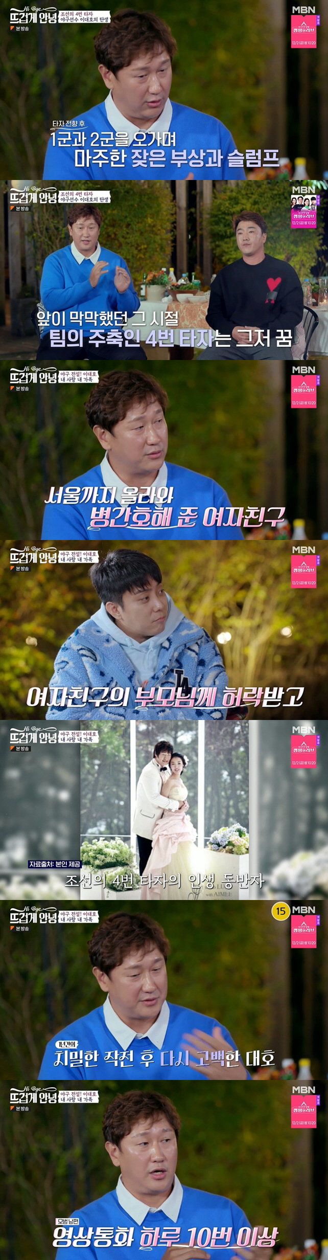 이대호는 "2002년부터 조금씩 활동하기 시작했지만 다리를 다치고 수술하면서 4, 5년이 힘들었다"라며 야구 선수로 쉽지 않았던 시간을 고백했다. 이에 유진은 "그때가 슬럼프죠?"라고 조심스레 물었고, 이대호는 "21~22세 때가 가장 힘들었다. 무릎 수술을 하면서 야구를 더 해야 하나, 더 할 수 있을까 이런 생각을 하며 진짜 막연하게 운동을 했다"고 밝혔다. 이어 "진짜 제가 이 자리에 올지도 몰랐고, 롯데 자이언츠 4번 타자가 된다는 것도 꿈이었다"라고 털어놨다.