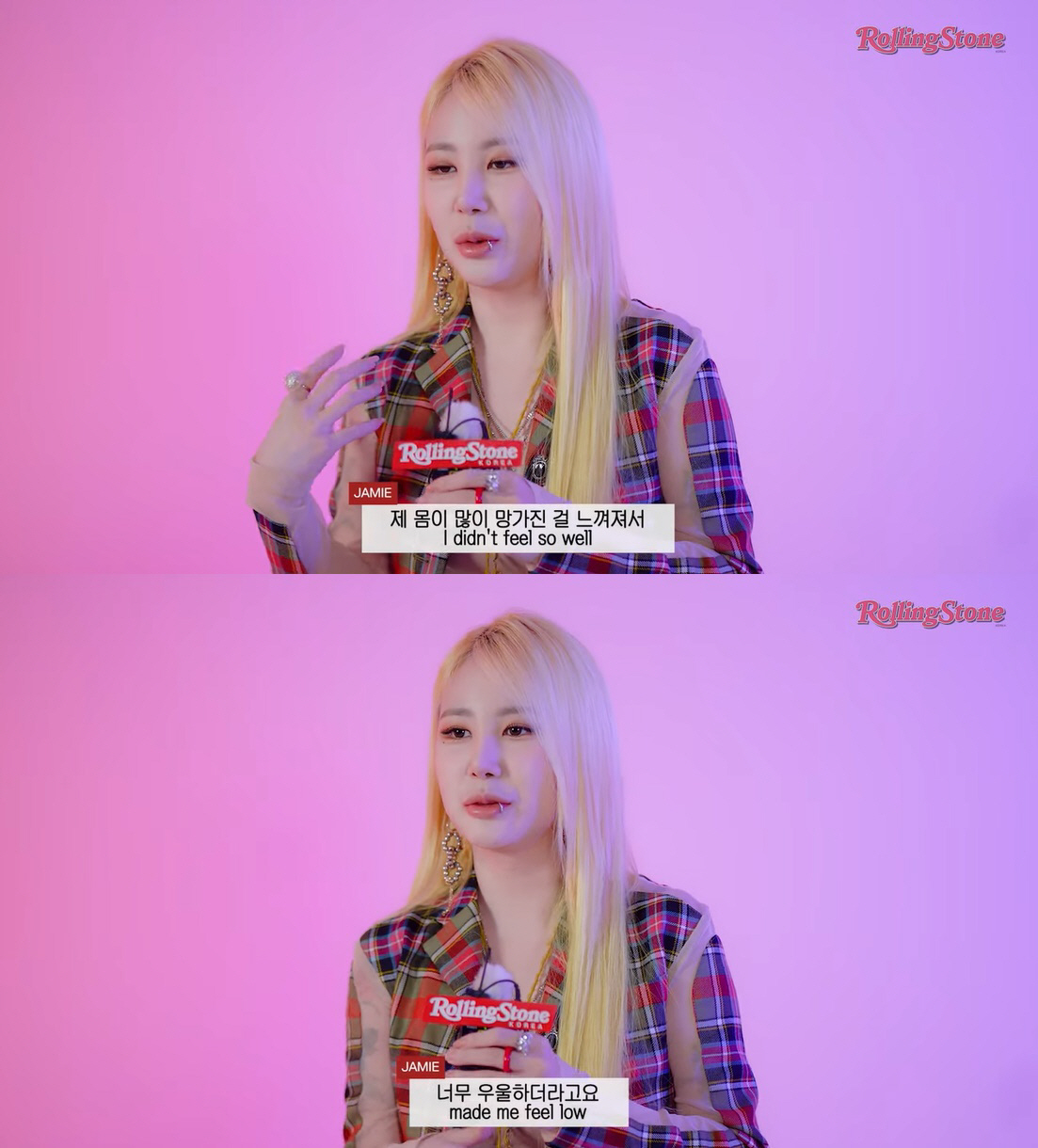반면 힘들었을 때를 묻자 제이미는 "뮤직비디오를 찍기 전에 재킷을 먼저 찍었다. 기간이 길어 또 뮤직비디오를 찍었는데 텀이 있어 어려웠다. 저는 일을 해야 하는 성격 같다. 일하다가 멈춰 집에 있으면 우울했다. 바쁠 거면 계속 바쁘고 쉴 거면 푹 쉬어야 하는 것 같다. 첫 재킷 촬영 후 몸이 망가진 걸 느껴서 안 먹던 음식도 먹고 다시 건강해졌다"고 전했다.