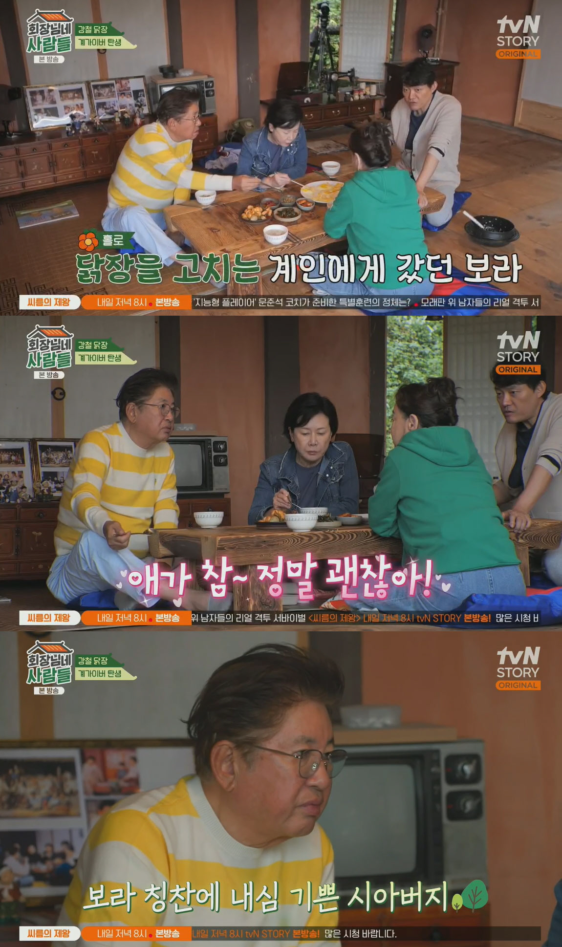 황보라가 홀로 닭장을 고치러간 이계인을 돕기 위해 함께 있다는 말을 들은 김수미는 김용건에게 "애가 참~ 정말 괜찮아! 오빠 며느리 잘 봤어"라고 극찬했다. 김용건은 "그래?"라며 내심 기뻐하는 모습을 보였다.
