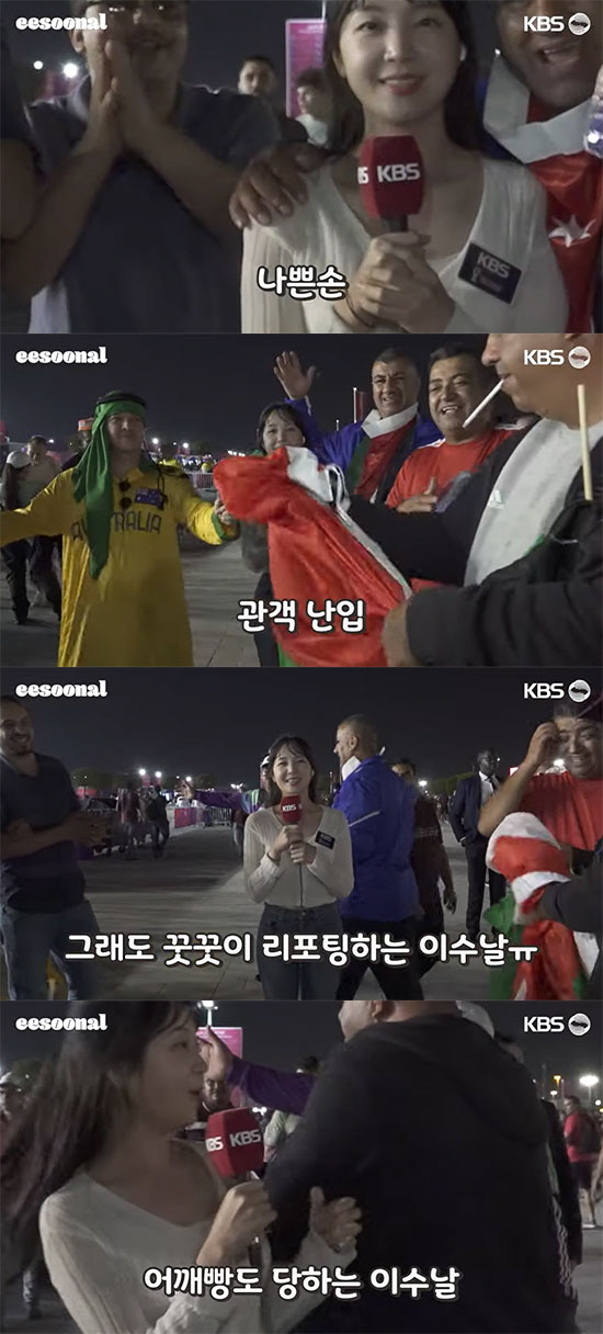 공개된 영상에는 지난 20일 카타르 알바이트 스타디움에서 열린 월드컵 개막식을 리포팅 하는 정이수의 모습이 담겼다. 개막식 현장 분위기를 전해야 하는 정이수가 리포팅을 준비하던 중 주변을 지나가는 외국인 무리가 다가와 방송을 방해했다. 그럼에도 꿋꿋하게 멘트를 이어가는 정이수에게 어깨에 손을 올리는 무례한 행동을 해 놀라움을 안겼다.