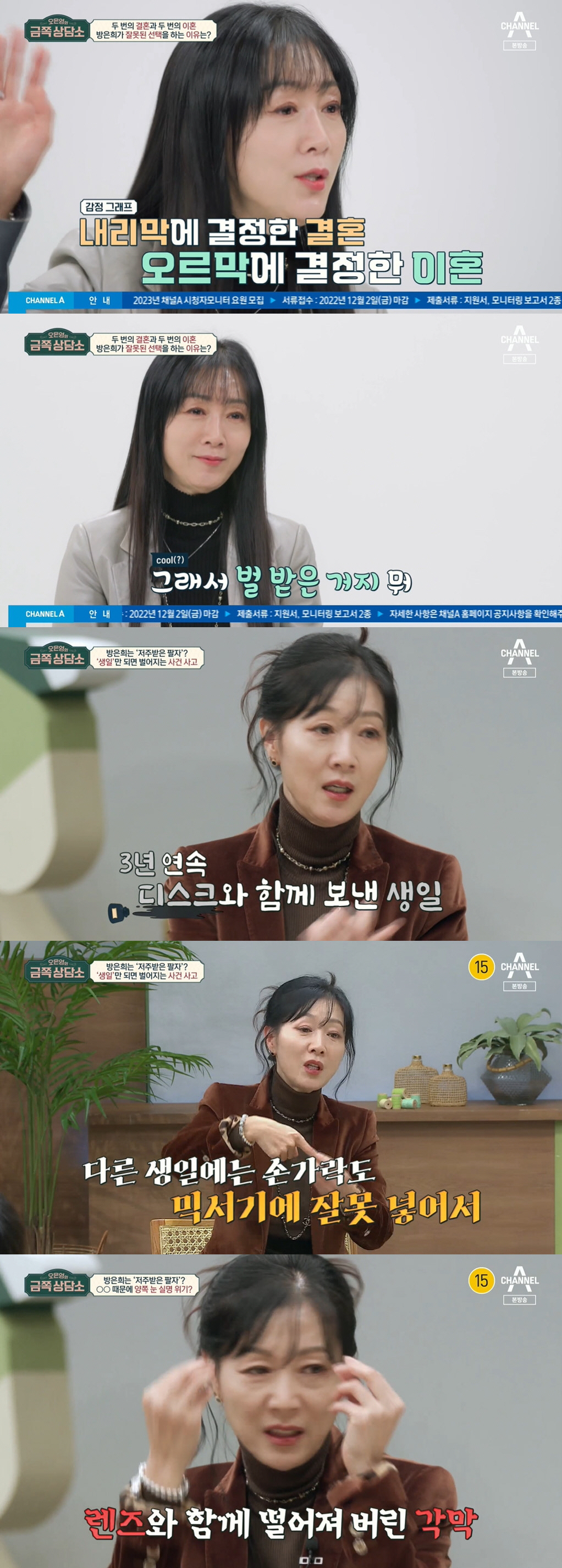 방은희는 "선택에 대한 책임을 질 수 있다고 저를 건방지게 생각을 했다. 결혼하면 외롭지 않게 열심히 살면 되겠지 생각을 했는데 현실은 그렇지 않더라"면서 "두 번째 이혼을 결심한 이유는 밥을 같이 먹어도 외롭더라. 혼자 먹는 것보다 더 외로울 정도"라고 털어놨다. 그는 "중학생이었던 아들에게 이혼에 대한 의견을 묻자, '엄마 나 때문에 참지마'라고 하더라. 안 외로우려고 이혼했다. 여자로서 살고 싶어서 이혼을 선택했다"고 밝혔다.