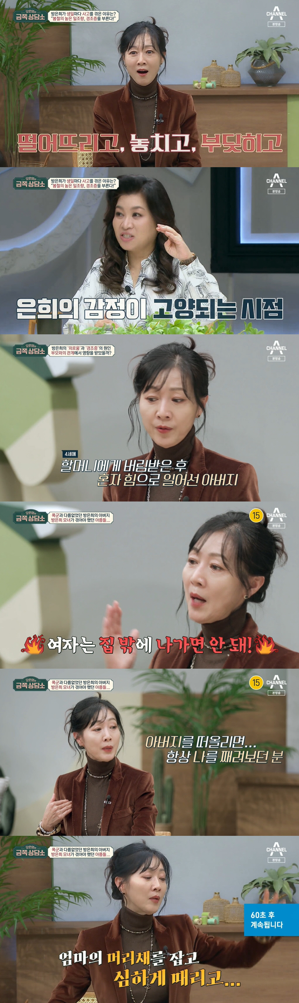 16세에 방은희를 낳은 어머니, 당시 아버지 나이는 25세. 방은희는 "할머니에게 4살 때 버림 받은 후 혼자 힘으로 일어섰다. 할머니가 아버지를 버렸다는 사실 때문에 '여자는 집 밖에 나가면 안돼'라며 가부장적이셨다"면서 "아버지를 떠올리면 째려보던 모습 밖에 안 떠오른다. 아버지가 오셨는데 엄마가 없으면 엄마의 머리채를 잡고 심하게 때렸다"면서 눈물을 흘렸다.