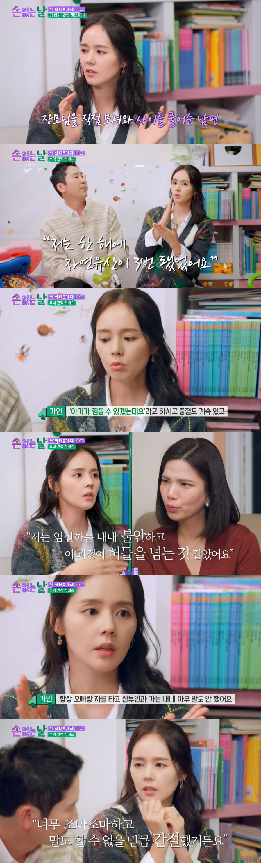 한가인은 "임신이란 과정 전체가 아름답고 엄마가 즐겨야될 행복한 시간인데 난 임신한 내내 불안하고 과정이 허들을 넘는 거 같았다. 항상 남편과 차를 타고 산부인과 가는 내내 아무 말도 안 했다. 너무 조마조마하고 말도 할 수 없을 만큼 간절함이 있다"며 "'잘 있나?', '잘 지내고 있나?' 싶어서 내가 집에서 확인하고 싶은 마음에 초음파 기계까지 샀다. 매번 심장이 문제였으니까 심장이 뛰는지 너무 궁금했다. 그땐 뭐라도 잡고 싶어서 그렇게 하고 싶었다"고 말했다.