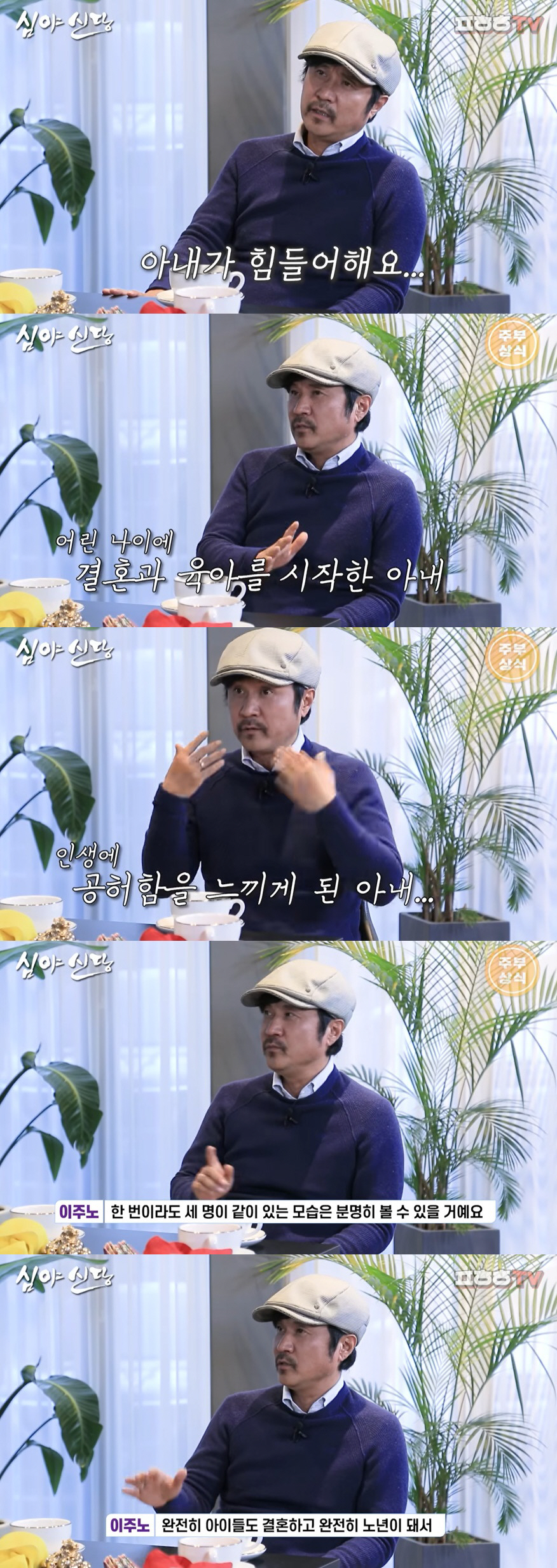 정호근은 이주노의 23살 연하 아내의 건강을 염려했고 이주노는 아내가 셋째 유산을 했다고 고백했다. 이주노는 "아내가 저를 만나 거의 스무살 때 시집 왔다. 아이 낳고 십몇 년 차가 됐는데 힘들어 한다. 그 전에는 저희가 먹고 살기 힘들다 보니까 애들 챙기느라 정신 없다가 애들 좀 크니까 내 인생은 뭐였지? 싶은가 보다"라고 털어놨다.