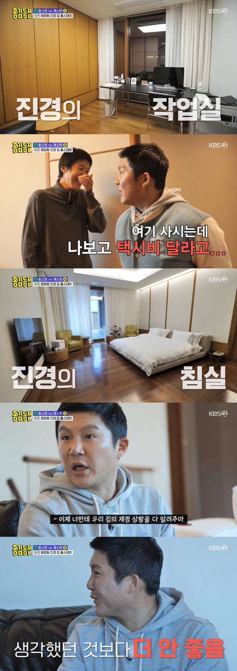홍진경은 "이 집에 살면서 행복을 느낄 때가 언제냐"는 질문에 "항상 감사하다"고 답했다. 홍진경은 "어렸을 때 이런 집에 사는 게 꿈이었다. 너무 힘들게 살았다. 장판 찢어지면 초록색 테이프 붙이는 집에 살았다"며 "그걸 몰랐는데 2층 집에 사는 친구 집에 다녀오고 나서 우리 집이 안 좋다는 걸 알았다. 그래서 집에 대한 로망이 있었다"고 밝혔다.