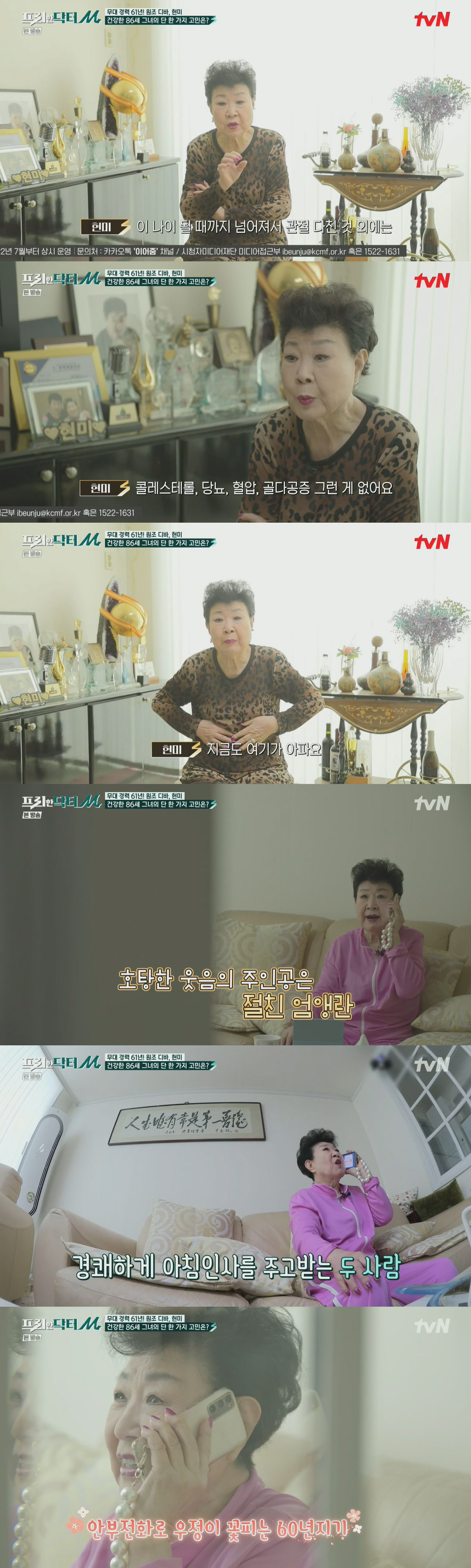 현미는 냉수 한잔으로 아침을 시작했다. 이어 60년지기 절친 엄앵란에게 전화를 걸어 경쾌한 아침인사를 주고받았다. 현미가 "엄앵란 여사님 안녕히 주무셨습니까"라고 하자 엄앵란은 "불량하게 주무셨습니다"라고 받아쳐 웃음을 자아내기도. 또 현미가 "오늘도 건강하고 씩씩하고 행복하게 지내세요. 우리 건강하게 100살까지 이렇게 통화하자. 안녕히 계세요. 잘 있어"라고 전화를 끊으려하자 엄앵란은 "어디 죽으러가니?"라고 농담해 모두를 웃겼다.