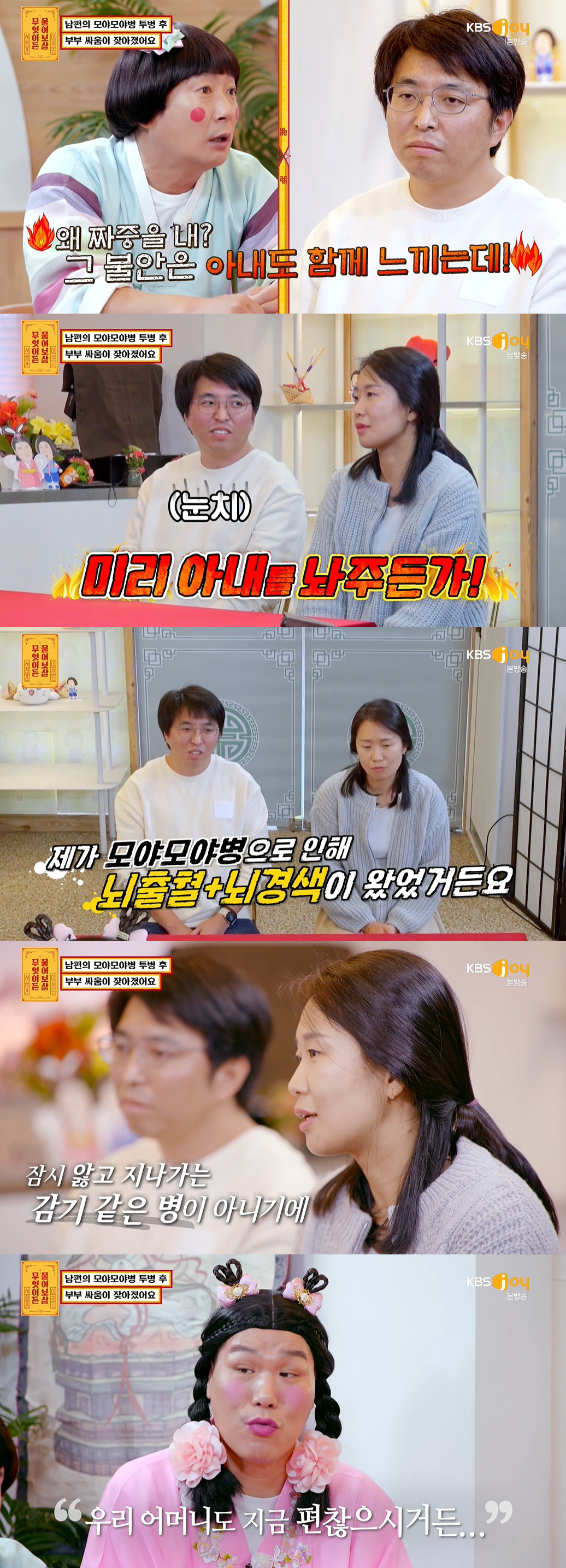 결혼 11년 차 30대 부부도 등장했다. 남편은 "모야모야병으로 인해 뇌출혈과 뇌경색이 왔다. 수술 후 아내와 자주 싸우고 관계가 소원해졌다"고 고민을 털어놨다. 모야모야병은 뇌로 가는 혈관이 좁아지면서 비정상적으로 작은 혈관이 자라나 뇌경색이나 뇌출혈이 생기는 병. 아내는 "작년 5월에 뇌출혈이 생겼는데 두 달 후 또 터졌다. 첫번? 수술은 회복이 잘 됐는데 너무 빨리 재발한 탓인지 걷지 못했다. 언제 또 그럴지 불안한데 남편은 가볍게 생각하는 것 같다"며 자신의 걱정을 남편은 잔소리로 듣는다고 했다.