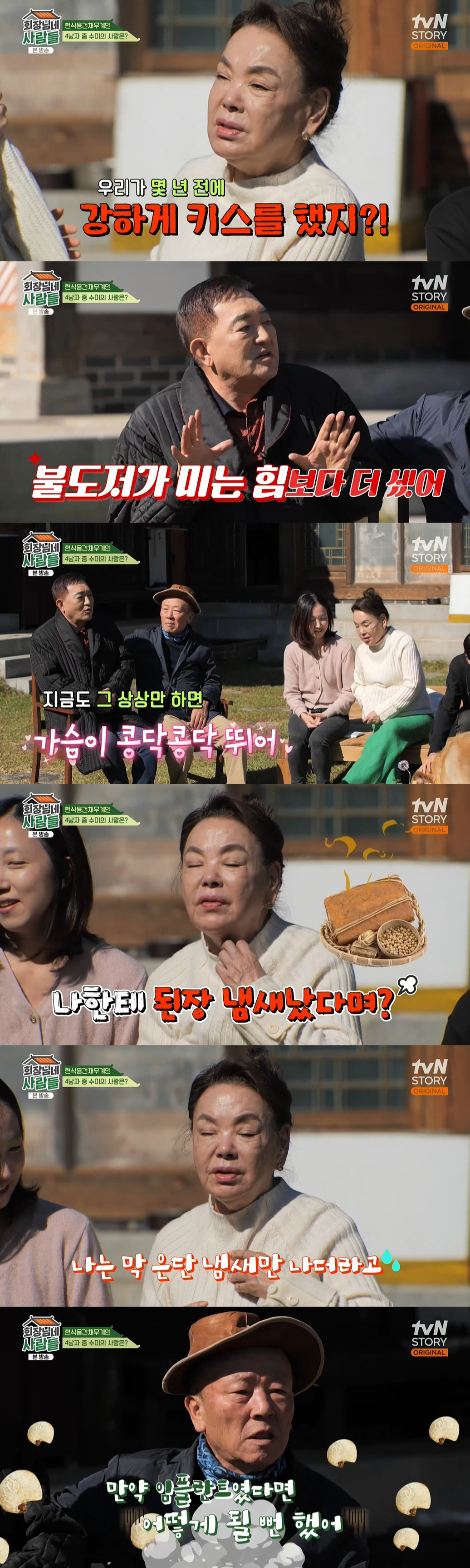 이날 임채무는 "'전원일기', '한지붕 세가족' 이렇게 만날게 아니라 같이 드라마 했으면 좋겠다"고 했고, 임현식은 "이 인원끼리 안 되는 게 뭐가 있겠냐"고 했다. 그때 김수미는 임채무에게 "우리가 몇 년전에 강하게 키스하지 않았냐? 20년 됐지?"라며 추억 토크를 했다. 영화 '못 말리는 결혼' 촬영 중 김수미가 임채무에게 기습 키스신을 펼쳤던 것. 이에 임채무는 "배우 생활 50년 하면서 내가 당해보기는 처음"이라면서 "불도저가 미는 힘보다 더 셌다"며 당시를 회상해 웃음을 안겼다. 그러면서 임채무는 "지금도 그 상상만 하면 가슴이 콩닥콩닥 뛴다"며 너스레를 떨었고, 이에 김수미는 "나중에 인터뷰 보니 나한테 된장 냄새 났다며? 나는 은단 냄새 났다"고 해 웃음을 안겼다. 이를 들은 임현식은 "조심해야 한다. 만약 임플란트였으면 어떻게 될 뻔 했냐"고 덧붙여 폭소를 안겼다.