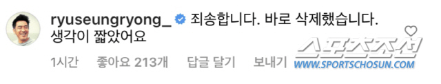 해당 소식이 커뮤니티를 통해 빠르게 퍼지자 류승룡은 "죄송합니다. 바로 삭제했습니다. 생각이 짧았어요"라고 사과했으나, 한국 축구팬들은 류승룡에 동조하는 분위기.