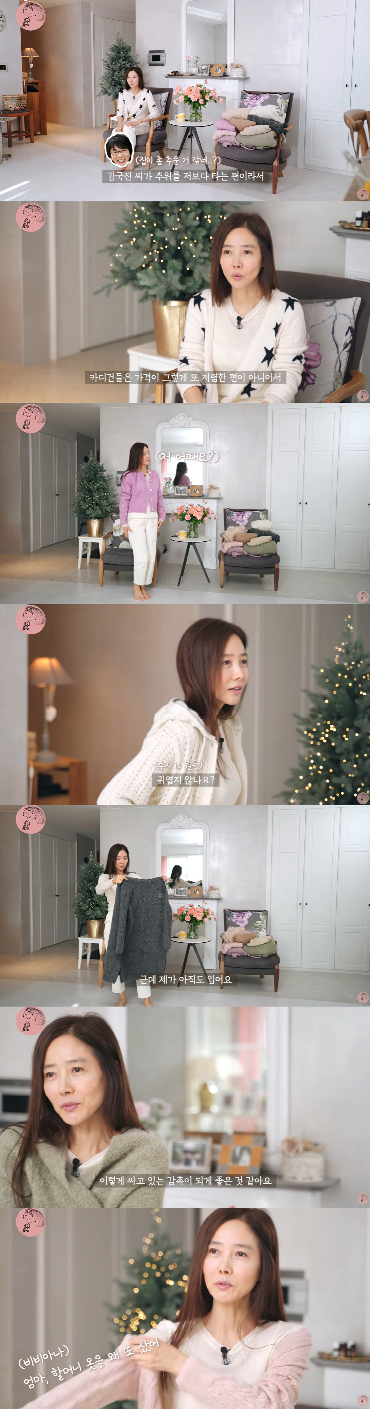 자주 입는 카디건들을 꺼내놓은 강수지는 "많은 것들을 갖고 있지 않아서 참 민망하긴 하다"며 "그래도 날씨가 쌀쌀해졌고 하니까 갖고 있는 카디건 보여드리도록 하겠다. 취향이 달라서 예쁘지도 않은 카디건일 수 있는데 '강수지는 저런 카디건을 입는구나' 이렇게 봐주시면 될 거 같다"고 전했다.