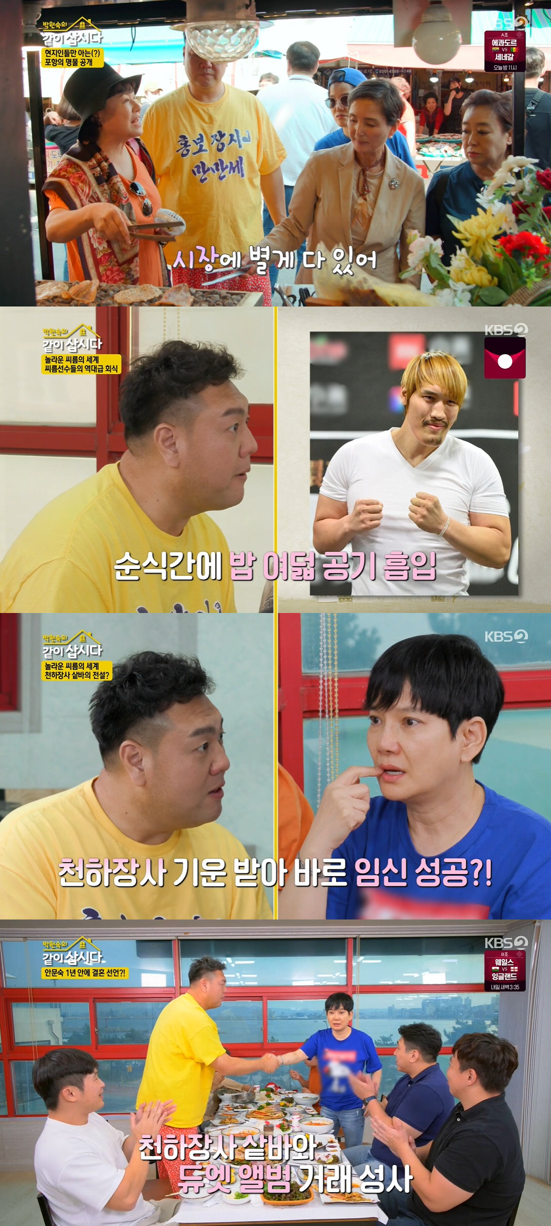 이어 횟집으로 향했고 백승일은 씨름 후배들도 여럿 불러 함께 해산물 파티를 벌였다. 백승일은 "저번에 선수 17명에 스태프들까지 25명이 회식했는데 그날 음식값이 1000만 원이 나왔다. 최홍만과 같은 팀이었을 때 봤는데 혼자 밥 여덟 공기를 순식간에 먹더라"라며 선수들의 남다른 먹성을 언급해 놀라움을 자아냈다. 이에 안문숙은 "불의를 목격하면 어떻게 하냐"며 궁금해했다. 백승일은 "그냥 간다. 운동하는 사람과 싸움하면 크게 다친다. 저희에게 잘못 걸리면 그렇다. 일부러라도 피하는 경향이 있다"고 말했다.
