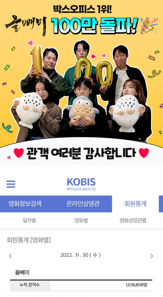 영화관 입장권 통합전산망에 따르면 '올빼미'는 11월 30일(수) 오전 7시 기준 누적 관객 수 1,036,808명을 기록하며 100만 관객을 돌파했다. 역사적 미스터리에 영화적 상상력을 더한 새로운 작품으로 관객들의 흥미를 자극하는 것은 물론, 눈과 귀를 사로잡는 다채로운 볼거리와 풍성한 음악으로 영화적 체험을 선사하며 관객들의 마음을 사로잡았다는 평이다. 특히 개봉 첫날부터 7일 연속 박스오피스 정상을 지키고 있어 앞으로 장기 흥행을 이어갈 것으로 기대된다.
