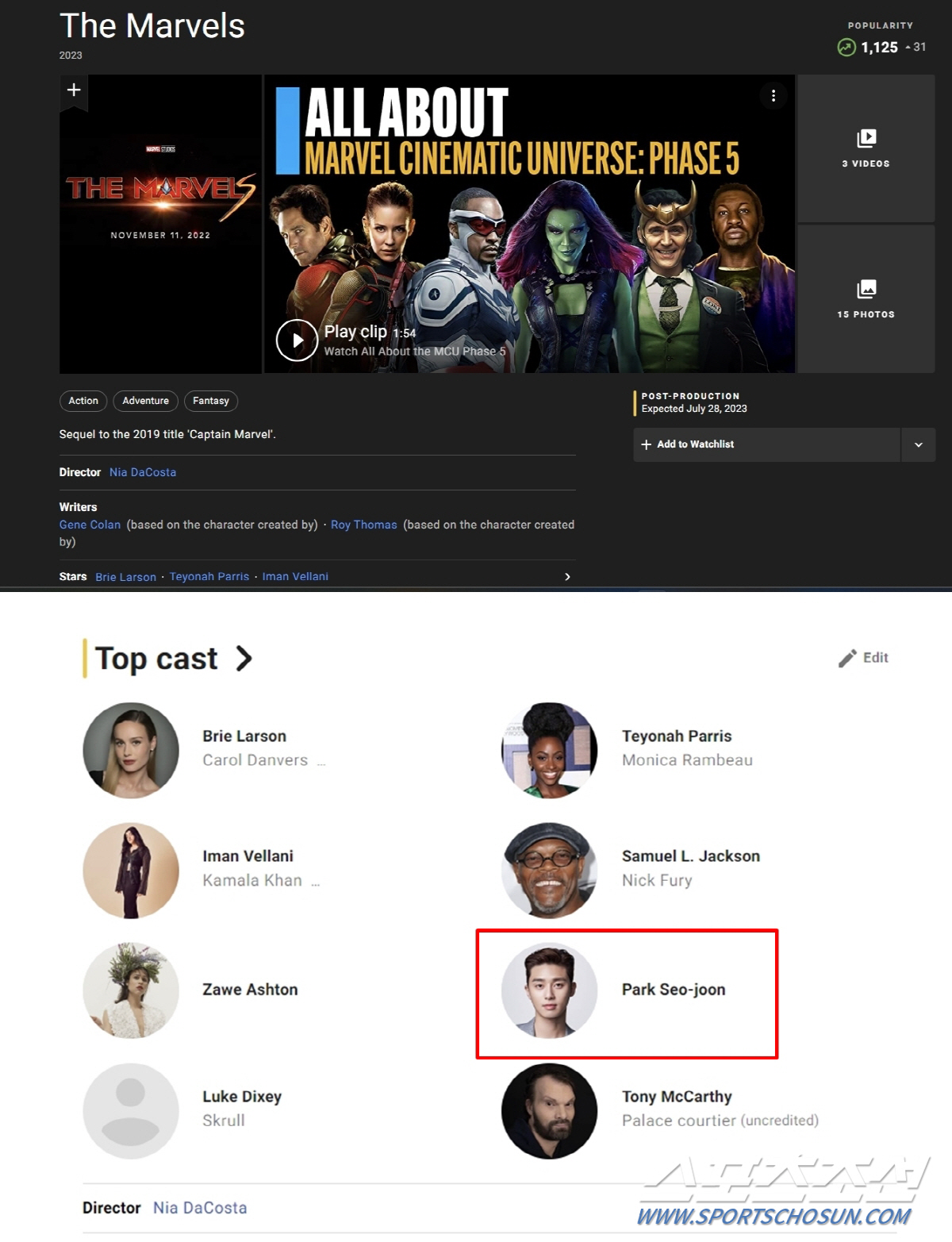 전 세계 최대 규모 영화 관련 미국 데이터베이스 사이트 IMDB 역시 '더 마블스' 캐스팅 라인업에 브리 라슨, 테오나 패리스, 이만 벨라니, 사무엘 L. 잭슨, 자웨 애쉬튼에 이어 여섯 번째 톱 캐스팅 라인업으로 박서준의 프로필과 사진을 게재해 기대를 더했다. 디즈니 측은 '더 마블스'의 박서준 출연을 공식화 했지만 박서준의 캐스팅에 대해서는 함구 중인 상황. '어벤져스'를 기점으로 마블 히어로 시리즈에 대한 인기가 차갑게 식은 가운데 박서준의 첫 마블 진출작 '더 마블스'가 위기의 마블을 살릴 히든카드가 될 수 있을지 관심이 쏠린다.