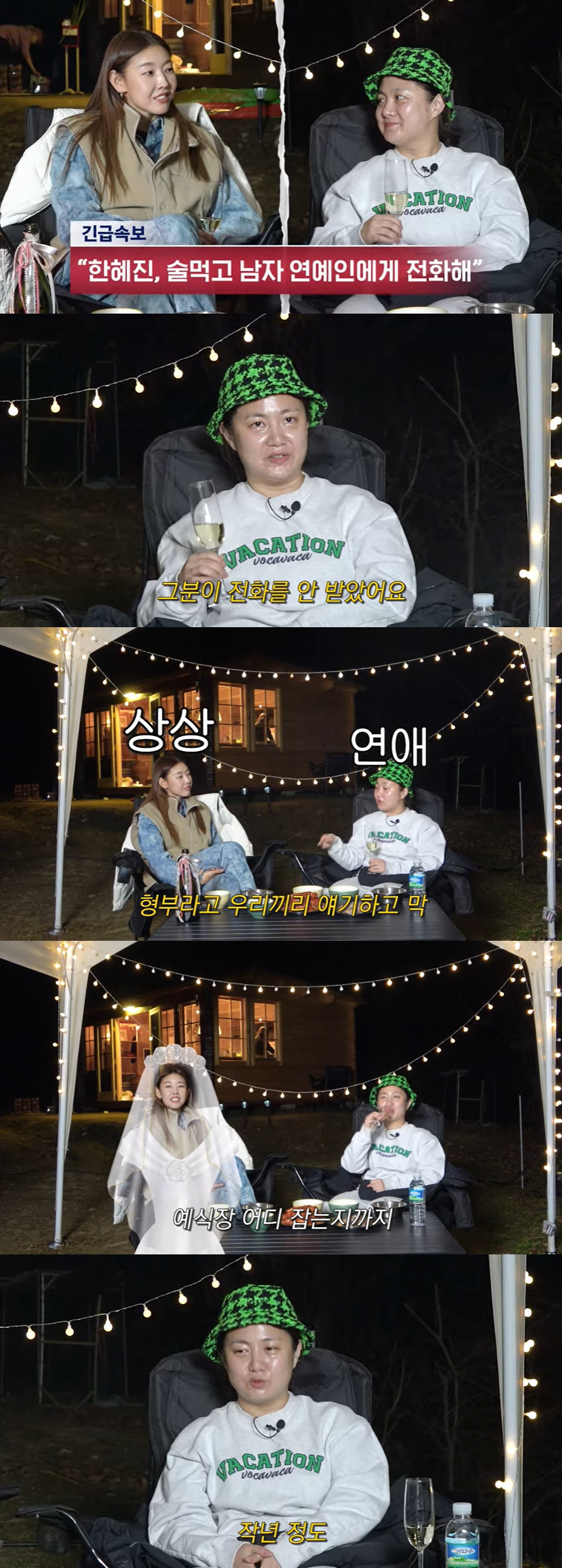 그때 박나래는 '한혜진 열애 썰' 질문에 "언니를 안 순간부터 지금까지 언니의 모든 남자를 다 본 거 같다"고 했다. 이어 '한혜진은 얼굴을 안 본다는 오해가 있다'는 말에 "얼굴을 안 보는 게 아니고 얼굴에 대한 기준점이 없다. 다 다르다"면서 "혜진 언니는 연애할 때 새장 안에 있는 파랑새다. 그냥 거기만 바라보고 지저귄다"며 한혜진의 연애 스타일을 밝혔다.