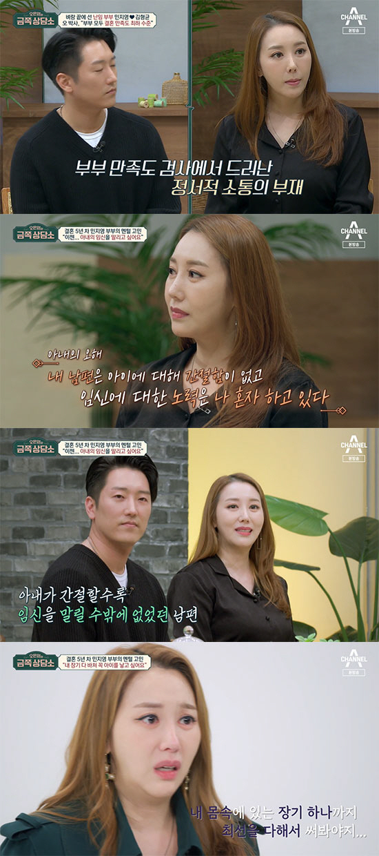 [스포츠조선닷컴 이지현 기자] 배우 민지영, 쇼호스트 김형균 부부가 '난임'으로 생긴 정서적 소통의 어려움에 대해 상담을 받았다.