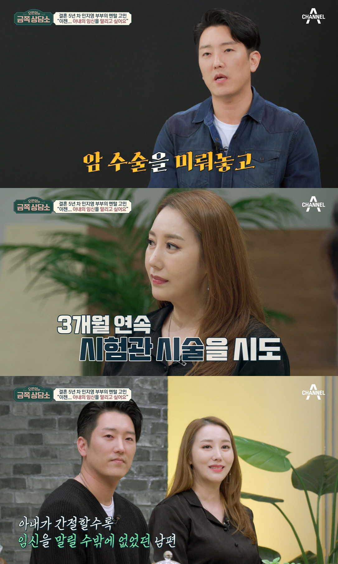 오은영은 민지영의 임신 집착이 '터널시야의 함정'과 같다며 "터널에서 어둡다고 동그라미 하나만 보고 가면 길을 잃지 않나. 결국 나중에 임신에 지나치게 몰두하게 된 거다. 지영 씨 마음 때문에 부부 시간을 갖는 게 어려워진 게 아닌가 생각이 든다"고 짚었다. 이어 "두 사람의 고민의 본질은 서로에 대한 염려와 걱정이다. 미래에 아이가 올 수 있을 거다. 그렇지만 지영 씨의 편은 남편이다. 내편은 남편 내편은 아내다"라며 서로의 신뢰를 강조했다.
