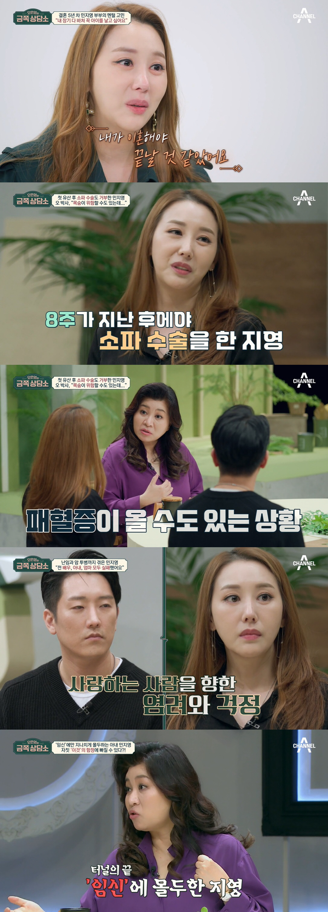또 민지영은 첫번째 임신 후 6주 차에 유산했다며 "받아들이고 싶지 않았다. 8주가 지난 후에야 소파 수술(임신이 유지되지 못한 자연 유산의 경우 자궁 내의 임신 산물을 제거하는 수술)을 했다"고 전하기도 했다. 이에 오은영은 "유산시 수술 시기를 놓치게 되면 패혈증이 올 수 있다"며 걱정 가득한 눈빛으로 바라봤다.