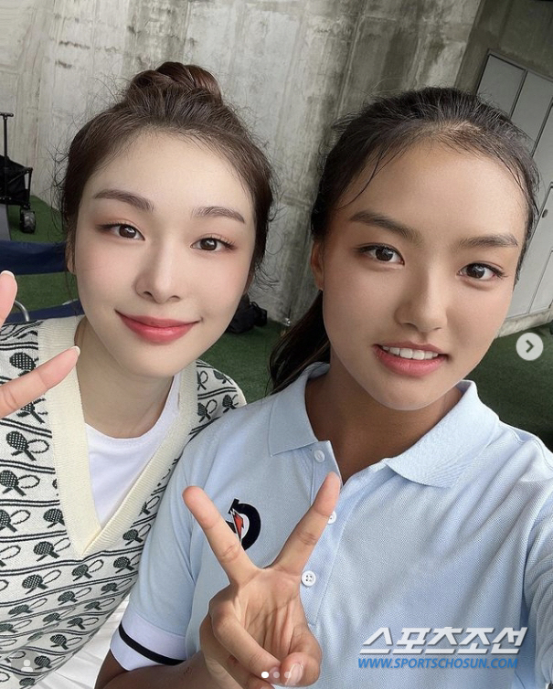 공개된 사진 속 재아는 김연아와 함께 다정하게 손가락 브이를 하며 포즈를 취했다.