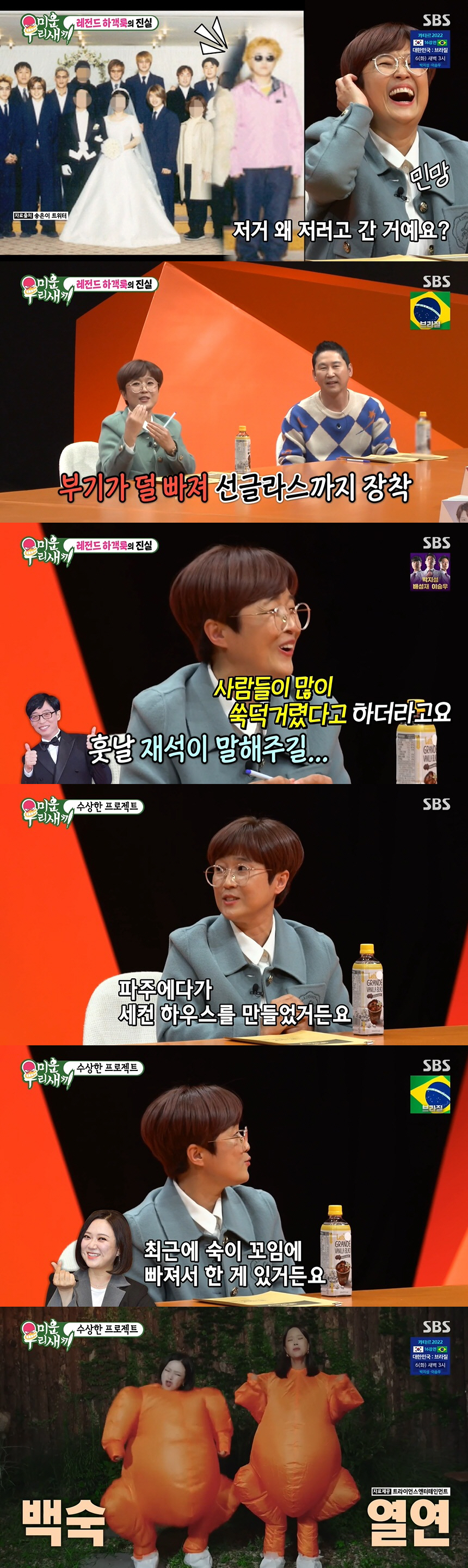 또 송은이는 노란 머리에 선글라스, 핑크색 재킷 등 파격적인 스타일로 레전드가 된 결혼식 하객 룩의 비하인드 스토리를 공개했다. 그는 "저 당시 상황을 말씀드리면 유재석, 이휘재 다 같은 소속사였을 때다. 근데 소속사 사장님이 내게 '넌 너무 개성이 없다. 변화를 줘라'라고 지령을 내려서 태어나서 처음으로 염색을 했다. 그리고 저 때 쌍꺼풀 수술하고 얼마 안 됐을 때라 부기가 덜 빠져서 부기 있는 눈으로 가는 것보다는 선글라스 쓰는 게 낫다고 생각했다"고 말했다. 이어 "솔직히 말하면 난 그때 내가 이상하거나 튄다고 생각 못 했다. 근데 훗날 유재석한테 들었더니 내가 지나갈 때마다 사람들이 쑥덕거렸다고 하더라"고 전해 웃음을 안겼다.