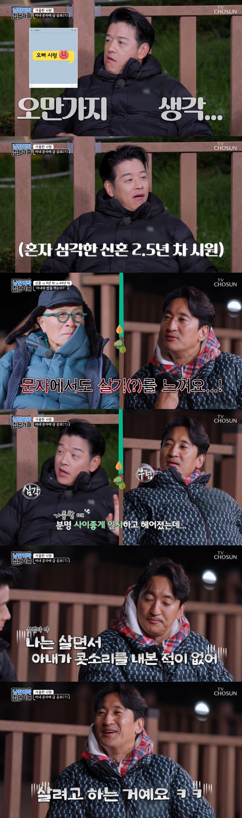 이에 류시원도 "그런 건 나도 있다"면서 "제가 어제 여기 오는데, 오는 동안 피곤해서 차에서 좀 잤다. 도착해서 '나 잘 도착했어'라고 하려고 했더니 문자가 와 있더라. '시렁! 오빠 시렁!'이라고 왔더라"면서 "딱 그 문자를 보고 '내가 뭘 잘못한 게 있나?' 떠날 때 너무 사랑스럽게 '갔다올게' 하고 가출을 했는데 저는 잔 것밖에 없다"며 억울한 표정을 지었다. 이어 그는 "그런데 갑자기 이모티콘 하고 '시렁!'"이라면서 "그 '시렁!'에 너무 많은 생각이 들더라. '나는 잘 못한 게 없는데'"라고 했다.