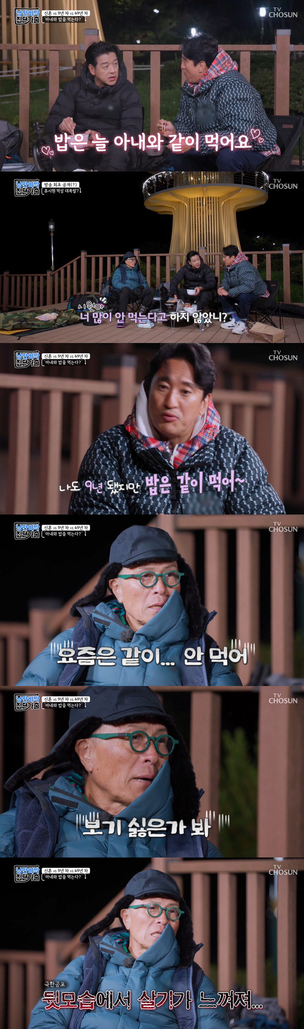 결혼 49년 차라는 허영만은 '식사 같이 하느냐'는 질문에 "요즘은 같이 안 한다. 요즘은 나만 차려주고 아내는 방에 들어가서 따로 먹는다"며 "추측컨대 보기 싫은가 보다"고 해 웃음을 안겼다. 이어 허영만은 "그게 익숙해져서 편하다"며 "이 정도 되면 피차에 대한 구체적 관심이 많이 떨어진다"면서 "그동안 많이 봐왔니까 행동을 빤히 안다"면서 굳이 말하지 않아도 서로를 너무나 잘 아는 49년차 부부였다. 그러면서 그는 "아내들이 나이가 들어가면서 등쪽을 쳐다봐도 살기가 보인다. 감히 범접을 못할 정도로 아우라가 쌓여있다"고 했다.