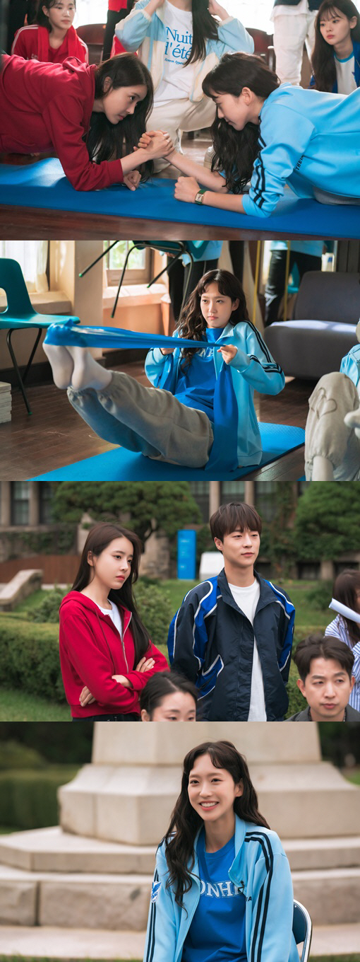 공개된 스틸에서 도해이는 연희대 신입생 대표로 호대 응원단장 정신혜와 힘겨루기를 하고 있다. 플랭크 자세를 유지한 채 손을 맞잡은 두 사람은 팽팽하게 힘 대결을 펼치고 있는데 표정에서 악착같은 투지가 엿보인다. 무엇보다 이하진에게 보라는 듯 코어 근력 운동에 집중하고 있는 도해이의 귀여운 표정이 보는 이의 웃음을 자아낸다.