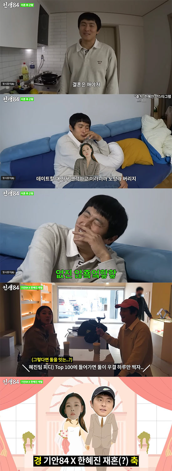 특히 기안84는 "혜진이 누나가 데이트할 때 자꾸 연락하고 이러니까 도망가 버리지"라고 투덜거렸다. 이에 "이혼한게 혜진 님 때문이에요?"라고 묻자, 기안84는 "없진 않죠"라며 큰 소리로 웃었다.