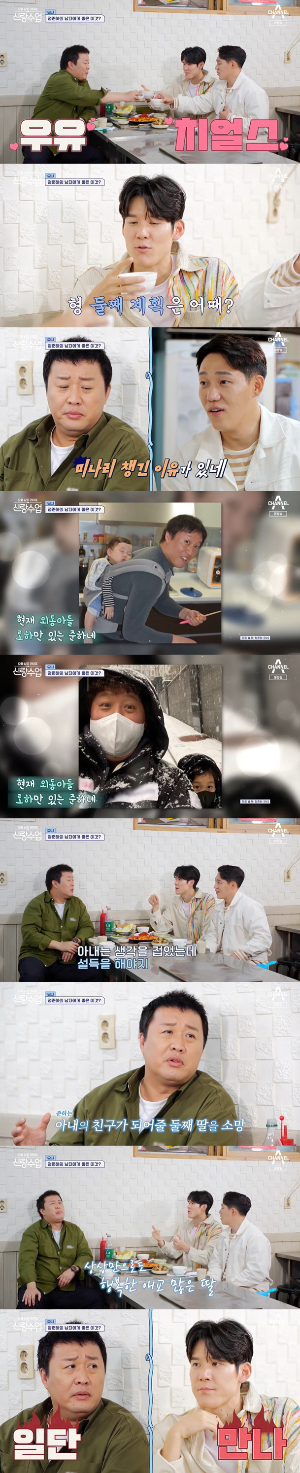 박태환은 "둘째 가지면 딸 낳아야 하지 않나"라며 정준하의 둘째 계획에 대해 물었다. 이에 정준하는 "아내는 일찍이 (둘째) 생각을 접었는데 내가 설득해야 한다"라며 "딸이 엄마의 유일한 친구가 될 수 있지 않나. 우리 엄마도 '아들 낳아 봐야 소용없다'하시는데, 이런 얘길 계속 주입시키고 있다"라고 고백했다.