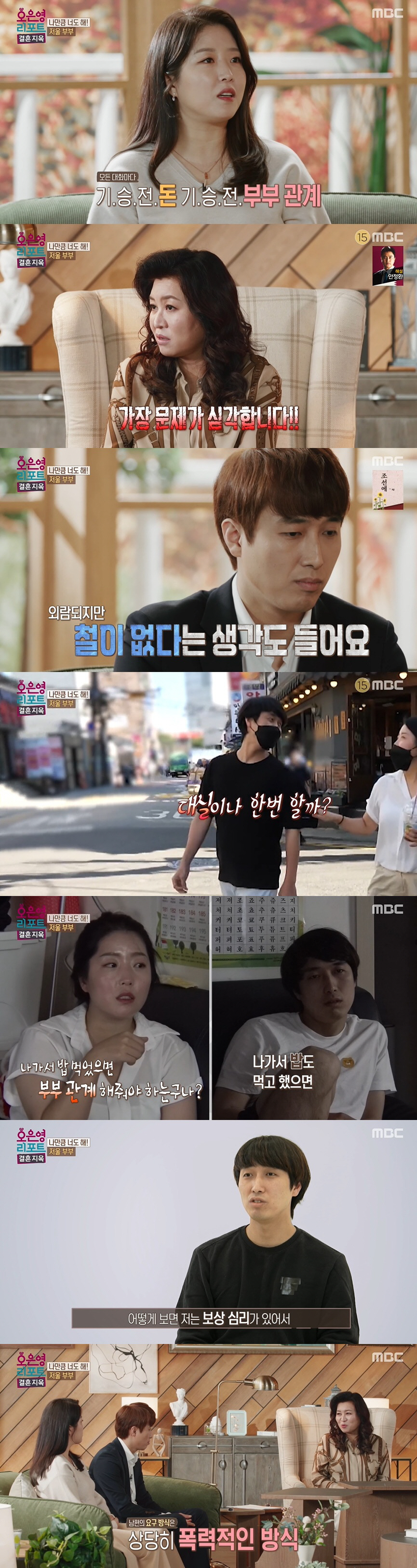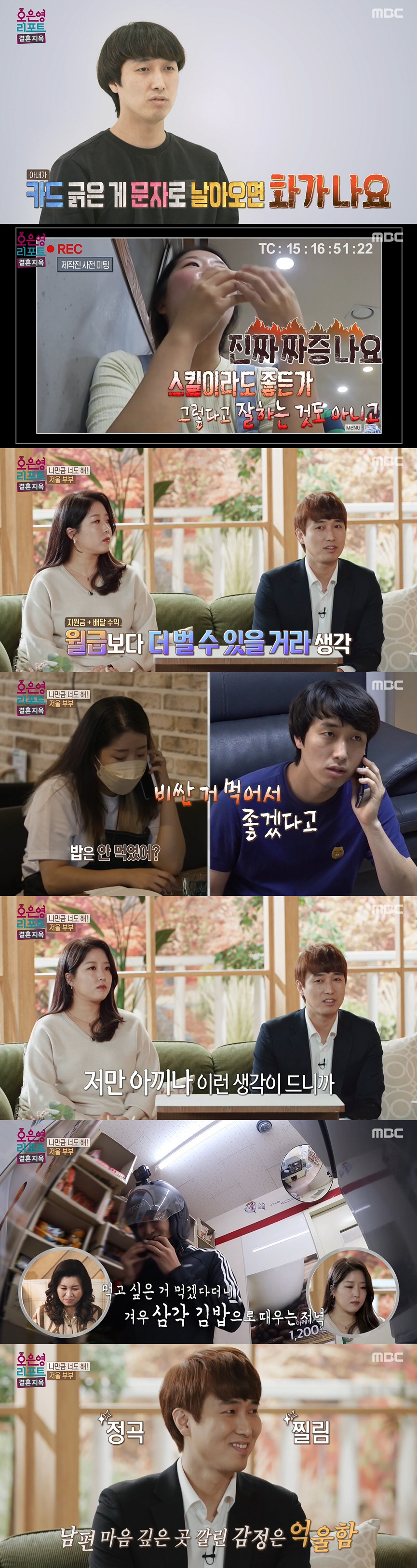 남편의 가장 큰 불만은 돈 문제였다. 아내가 카드를 긁은 게 문자로 날아오면 화가 난다고. 현재 가족의 생계를 위해 배달 대행 일을 하고 있다는 남편은 "난 삼각김밥도 아까워서 못 먹는데 (아내는) 전날 술 먹었다고 1만 2천 원짜리 짬뽕 먹고, 살 뺀다고 샐러드 집 가서 7~8천 원을 쓰는데 그건 아니지 않냐"며 서러움에 눈물을 흘렸다. 하지만 아내는 "남편이 불쌍한 척한다"고 냉랭한 반응을 보였다.