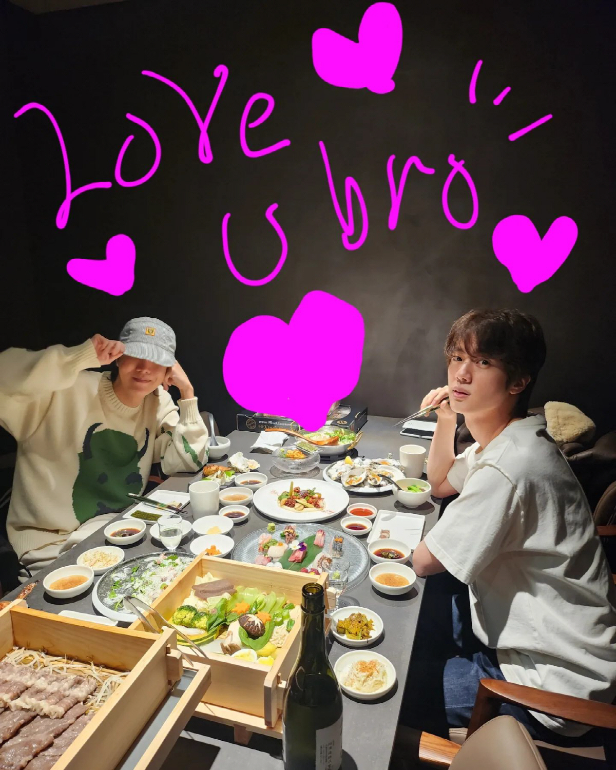 공개된 사진에는 제이홉이 진과 함께 어깨를 감싸 안고 밝게 웃는 모습이 담겨 있다. 두 사람은 서로를 바라보며 흐뭇한 미소를 보여 훈훈함을 자아냈다. 또 제이홉은 진과 함께 식사를 즐기는 모습을 공개하기도. 두 사람은 편백찜, 회 등 음식을 앞에 두고 행복하게 만찬을 즐기고 있다.