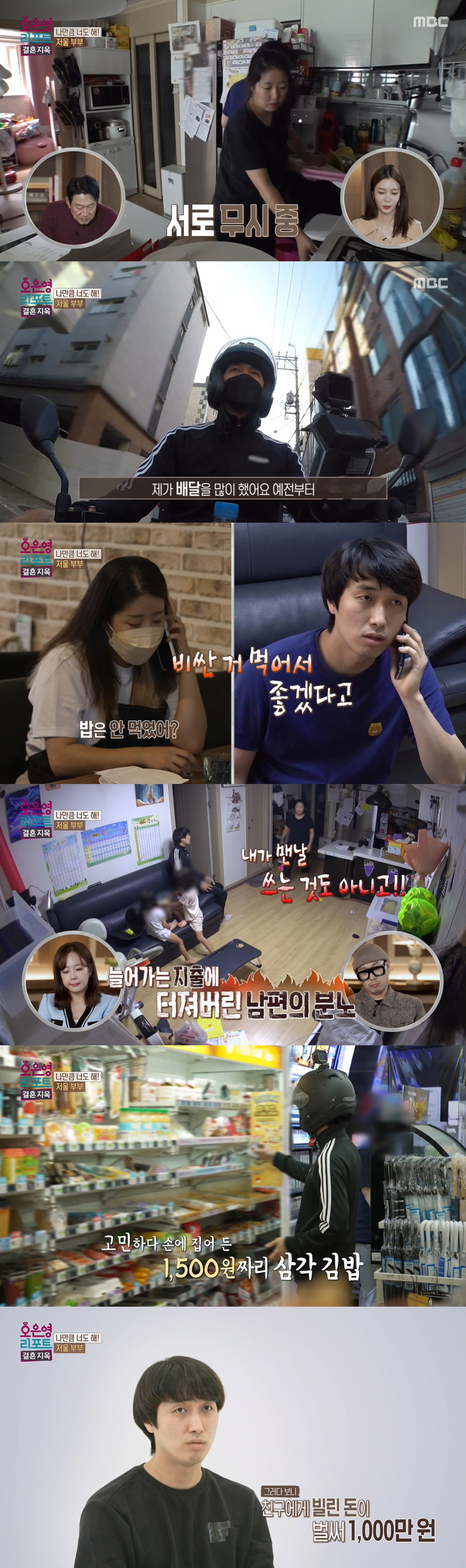 부부의 핵심 갈등은 금전문제였다. 현재 수입보다 많은 지출에 돈을 빌리 수 밖에 없었던 남편. 그러다 보니 친구에게 빌린 돈이 벌써 1,000만원. 이러한 상황 속 남편은 라면을 먹으며 허기를 달래는 반면, 아내는 점심시간에 이탈리안 식당에서 식사하고 커피숍에서 케이크과 커피를 디저트로 먹는 등 상반되는 모습을 보인 것. 남편은 아내의 점심 식사 카드 결제 내역이 휴대폰으로 전송되자마자 아내에게 전화를 걸어 "혼자 맛있는(비싼) 음식 먹어서 좋겠다?"면서 따졌지만, 아내는 익숙하다는 듯 시큰둥한 반응을 보였다.