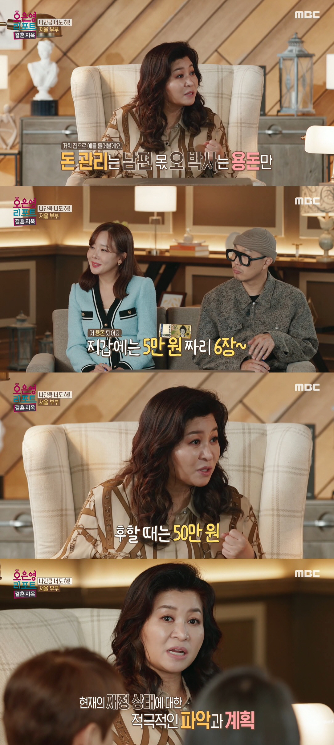 오은영은 부부에게 "교육비나 여러 경제 계획, 부채 등에 대해 의논을 하시냐"고 물었고, "전혀 아니다. 신혼 초에 정해야 했는데 각자 돈 벌고 알아서 쓰는 식이었다. 금전 문제로 부딪혀 비하게 된다"는 답이 돌아왔다.