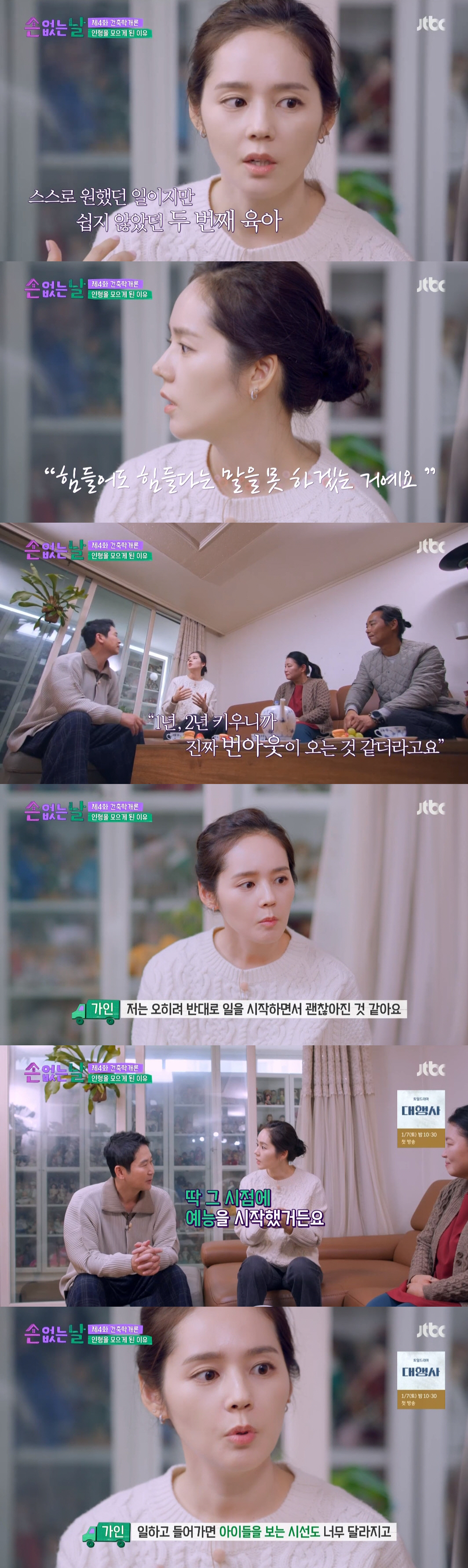 한가인은 "오히려 반대로 일을 시작하면서 괜찮아졌다"라며 "딱 그 시점에 예능을 시작했다. 일하고 들어가면 아이들을 보는 시선도 너무 달라졌다"라면서 새로운 환경을 겪으면서 이겨낼 수 있었던 번아웃이었다.