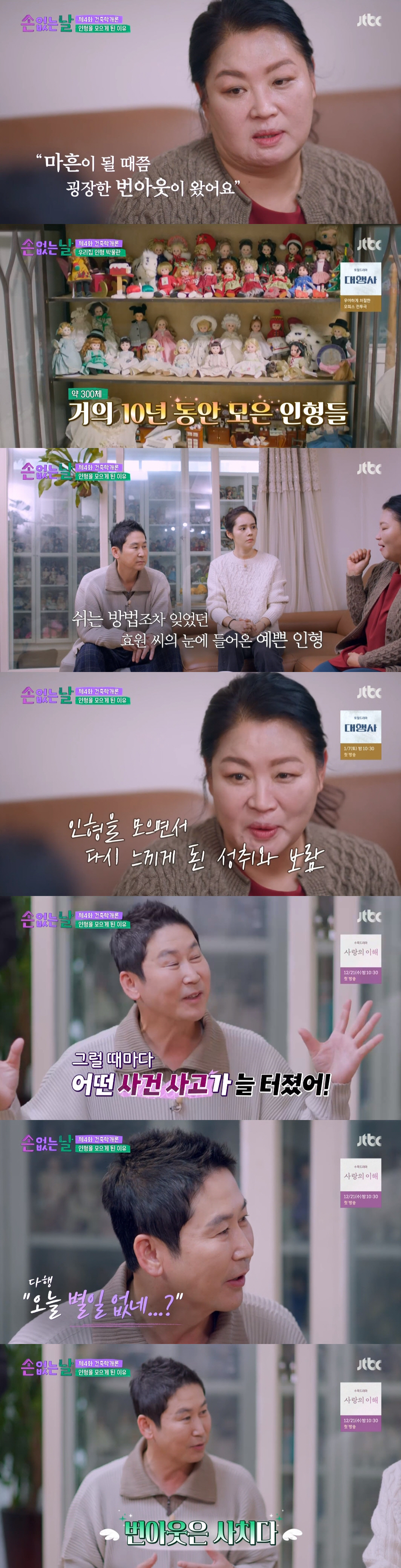 이날 신혼부부의 집 커다란 진열장에는 유명한 인형이 가득 채워져 있었다. 이에 의뢰인의 아내는 "출장이 잦은 직업이다. 마흔이 될 때 쯤 번아웃이 왔다"며 "2년간 남해로 떠났다. 그런데 쉴 줄 모르겠더라. 그때 예쁜 인형이 눈에 들어왔다"고 했다. 경매 사이트에서 경매 1등 해야만 살 수 있는 인형. 그는 "희열이 있더라. 하나 하나 모아가는 재미가 있더라. 그러면서 차츰 차츰 힘들었던 것도 잊고 조금씩 더 욕심을 내게 됐다"고 했다.