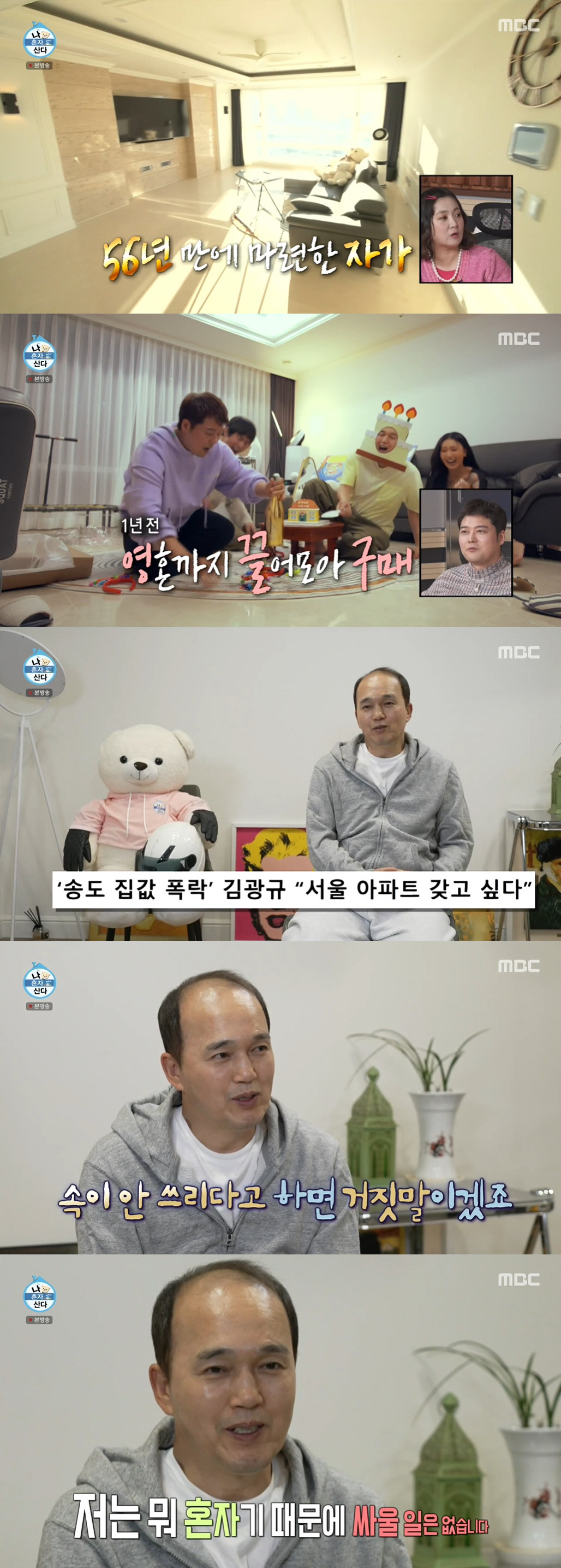 "시세 보는 건 하루 일과가 됐다"면서 시세를 확인한 김광규는 "10억에 사라고 했던 집이 25억이 됐다"면서 한숨을 내쉬었다. 김광규는 1년 전, 영혼까지 끌어모아 56년만에 자가를 마련했지만 최근 아파트값이 역대 최대 폭락했다. 김광규는 "제 허락도 없이 송도 집 값 떨어진 걸 제 이름을 쓴다"면서 "속이 안 쓰리다고 하면 거짓말이다"고 솔직하게 털어놨다. 이어 "잊어야지 하면서도 옛 생각이 난다"면서 "부부 같으면 엄청 싸운다고 하더라. 저는 뭐 혼자이기 때문에 싸울 일은 없다"며 씁쓸해 했다.