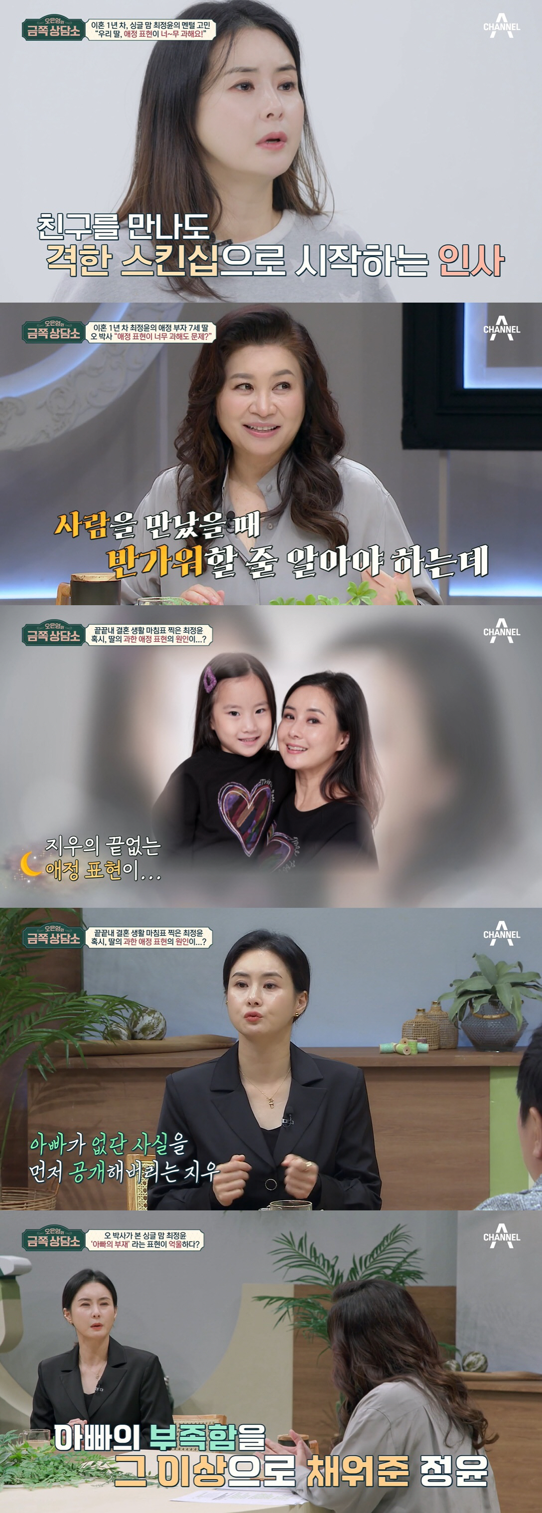딸이 캠핑을 다닌 후 외향적으로 변했다고 하자 오은영은 최정윤의 이혼과 딸의 성격 변화의 관련성을 물었다. 최정윤은 지난 2011년 이랜드 그룹 부회장 장남이자 그룹 이글파이브 출신 윤태준과 결혼했지만 최근 이혼하며 남남이 됐다.