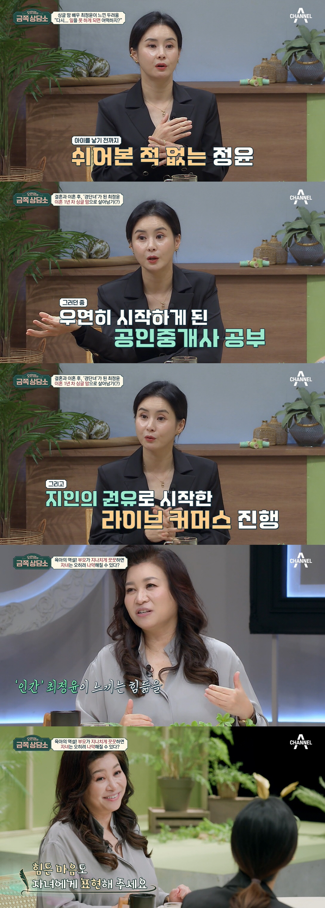 최정윤은 직업에 대한 고민도 전했다. 그는 "아이 낳기 전까지 일을 쉰 적 없다. 근데 일을 안 하고 있으니 경력 단절에 두려움이 생겼다. 찾아주는 사람이 없으면 먹고 살 길이 없다는 생각이 들었다"며 슬하에 딸이 있기에 더욱 커진 책임감과 부담감을 언급했다. 최정윤은 "할 수 있는 일은 파트타임으로 일하는 거였다. 동네 아르바이트를 알아봤는데 나이가 많아서 안 된다는 거다. 내 나이에 맞는 걸 하려면 시간대가 안 맞아서 큰일 나겠다는 생각이 들었다. 그러다가 우연한 기회에 공인중개사 공부를 했다. 자격증만 있으면 배우 일을 하면서도 할 수 있지 않나. 그래서 공부하기 시작했고, 라이브 커머스도 지인의 권유로 진행했다"고 이야기했다. 최정윤은 "새로운 일에 대한 걱정은 없다"며 씩씩함을 보였다.