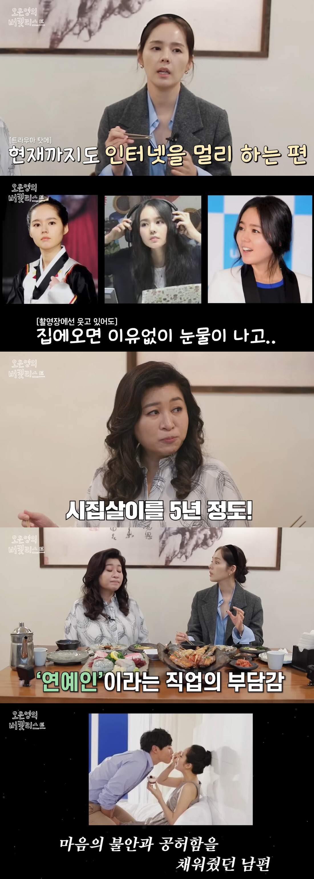 한가인은 "지금도 인터넷에 제 이름을 검색하지 않는다. 제 이름이 좋은 일로 기사가 나도 심장이 탁 떨어질 때가 있다"며 유명인으로서의 고충을 다시금 드러냈다. 이에 오은영은 "좋은 일이 담긴 기사에도 100개 중 95개는 선플이라면 5개는 아닐 수 있다. 95개보다 더 신경쓰인다"고 공감했다.