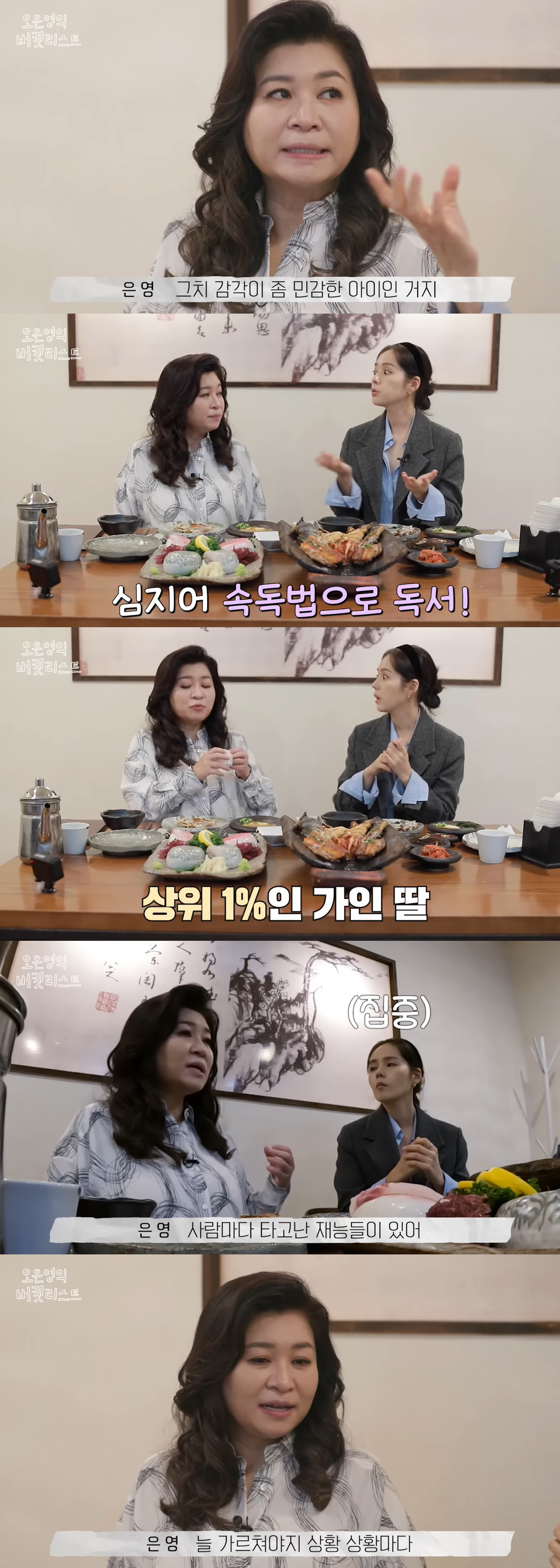 한가인은 "딸이 한 번 보면 다 외우고 하루 종일 책만 본다. 속독을 해서 저보다도 빨리 본다. 문제 풀이 능력도 빠르다. 처음엔 똘똘하다고 생각했는데 40개월 때 한글을 읽고 영어도 읽더라. 저는 알려준 적이 없었다"고 전했다. 이에 영재 검사를 했더니 상위 1%로 나왔다고. 한가인은 "처음엔 좋았다. 근데 눈치가 없는 건지 사회성이 떨어지는 건지 사람들과 코드가 조금 다르다고 느끼게 됐다. 교우관계가 걱정돼서 이것 때문에 일반 학교 가는 걸 포기했다. 소규모 학교를 가야 할 것 같다"고 고민을 털어놨다.