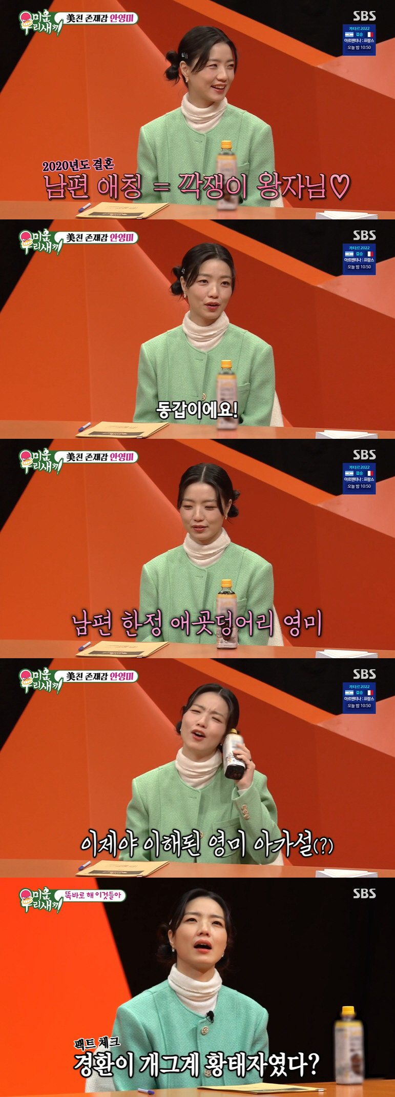 2020년 결혼한 안영미. 안영미가 남편을 부르는 애칭은 '깍쟁이왕자님', 남편은 안영미를 '아가'라고 부른다. 안영미는 "동갑이다. 서로 존대를 한다"고 밝혔다.