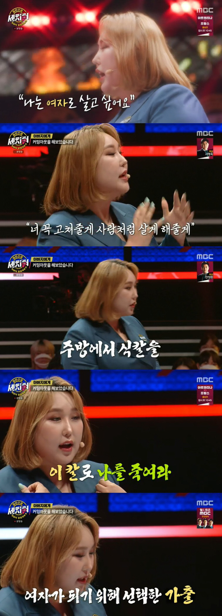 '마라맛 세치혀' 풍자의 이야기 주제는 커밍아웃이었다. 풍자는 "저는 부모님에게 커밍아웃을 세 번을 했다. 첫 번째는 중학교 때였다. 아버지께 여자로서 살고 싶다 했는데 아버지가 웃으셨다. 이제 이렇게 반항하냐더라. 고등학교 때 또 커밍아웃을 했다. 그땐 정신적으로 문제가 있는 거라 생각했다. 그래서 저의 손을 잡고 '꼭 고쳐줄게. 사람처럼 살게 해줄게. 미안해. 조금만 더 버텨보자'고 했다"고 밝혔다.