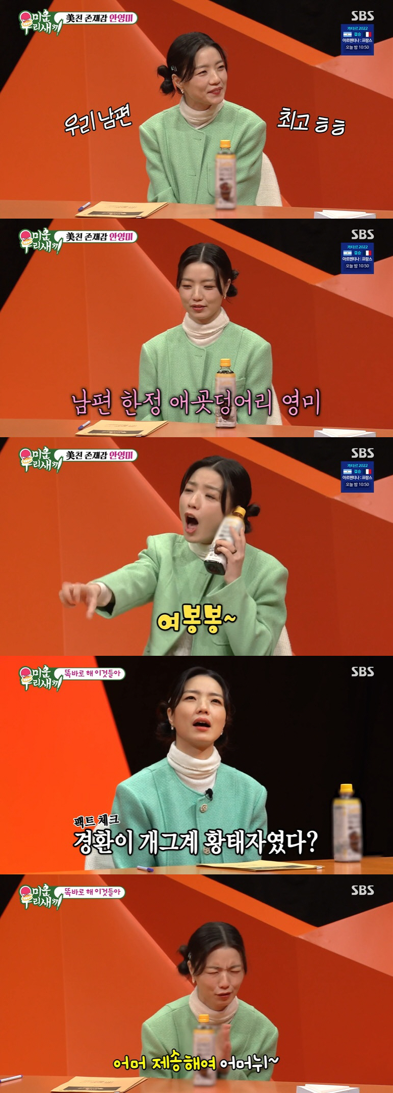 신동엽은 "안영미 부부는 부부싸움한 적이 없을 거다. 워낙 잘하고 애교도 많다. 남편하고 전화통화할 때 들어보면 못 듣는다더라. 너무 애교가 많아서"라고 지인들의 목격담을 전했다. 안영미는 "저는 그냥 하는 것"이라며 남편에게 하는 '여봉봉' 애교를 선보였다.