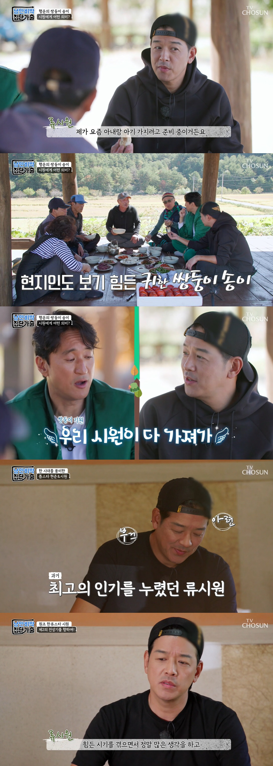 신현준은 또 류시원에게 "쌍둥이 송이 어디 갔어? 가지고 있어야 쌍둥이 낳지. 쌍둥이 생기면 마을에 와서 큰절해야 한다"라고 강조했다. 류시원은 "사실 아기를 가지려고 준비 중이다. 그래서 따로 가지고 가서 아내와 나눠먹겠다"라고 눈을 반짝였다.