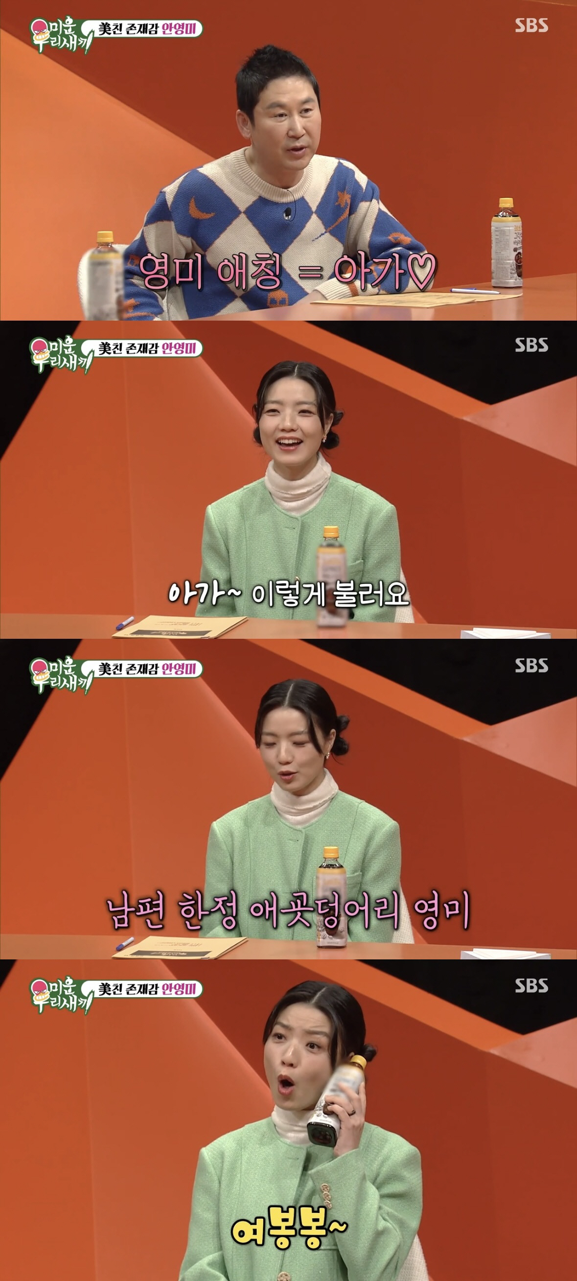 또한 신동엽은 "안영미 씨가 2020년에 결혼을 했는데 남편의 애칭을 깍쟁이 왕자님이라 부르고, 남편은 안영미 씨를 아가라고 부른다"며 "제가 볼 땐 부부 싸움을 한 적이 없을 것 같다. 안영미 씨 워낙 애교도 많다더라. 남편이랑 전화할 때 들어본 사람들은 못 듣겠다고 할 정도다"라고 전했다.