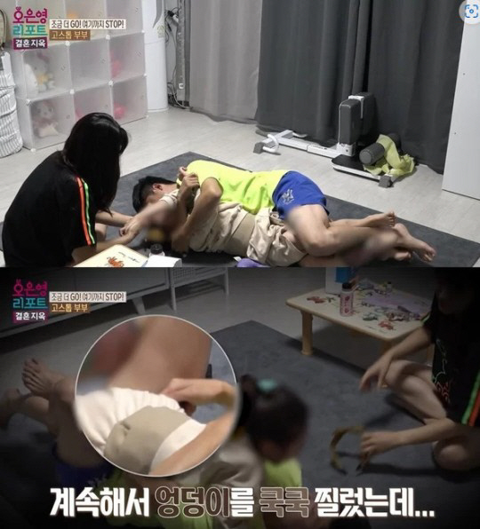 논란은 남편이 아이를 다리 사이에 꽉 끼고 끌어안으며 신체를 접촉하는 모습에서 비롯됐다. 아이가 강하게 불편함을 표현했지만 남편은 아랑곳하지 않고 '주사 놀이'를 빙자, 신체 접촉을 이어갔다. 이후 제작진은 의붓딸 신체 접촉 논란에 결국 해당 장면을 다시보기 서비스에서 삭제했지만, 문제의 장면은 따로 편집돼 여전히 입방아에 오르내리고 있다. 시청자들은 당시 방송에서 신건강의학과 전문의 오은영 박사가 "늘 아이들에게 팬티 속은 절대로 남의 걸 만지면 안 되고 내 걸 보여주지도 말라고 한다. 만 다섯 살이 넘으면 이성의 부모가 목욕할 때 아이의 생식기 부위를 직접 만지지 말라고 한다. 친부여도 조심해야 할 부분이고 새아빠는 더욱 조심해야 한다. 하지 말아야 행동의 선을 지키는 것이 아이에 대한 존중"이라며 남편의 태도를 지적하긴 했지만 너무 소극적이었다며 분통을 터트렸고 프로그램 폐지 요구를 이어가고 있다.