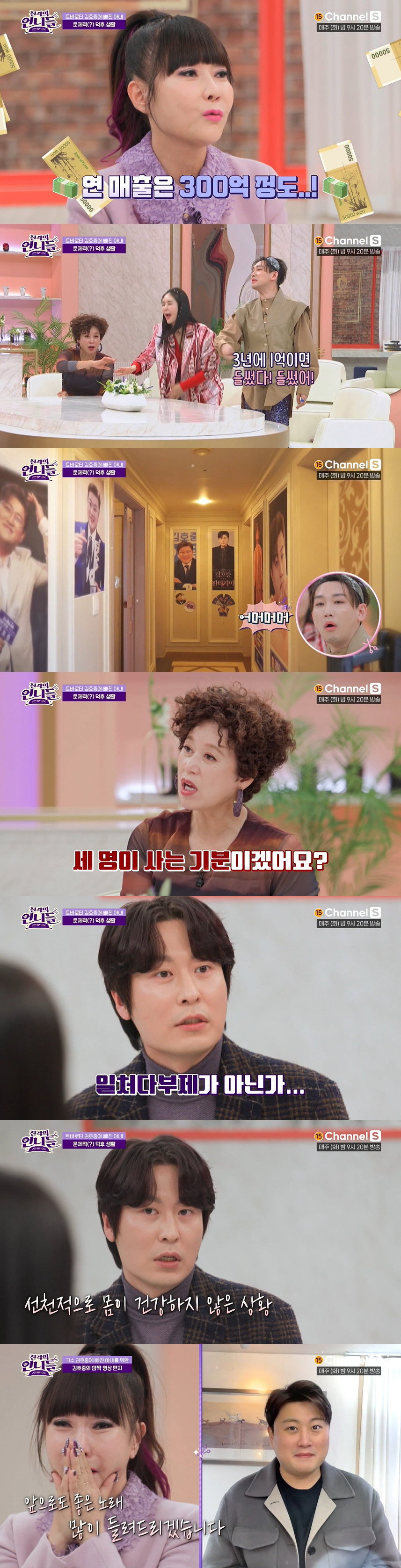 특히 남편은 "김호중을 따라다니면서 아내가 쓴 돈이 3년간 1억원 정도 된다"고 말해 충격을 안겼다. 굿즈 구매는 기본, 콘서트 전일 참석, 앨범도 100장, 200장 단위로 N차 구매한다고. 아내는 "앨범은 지인들에게 선물한다. 팬이 아니신 분을 팬으로 만드는거다"며 팬심을 드러냈다.