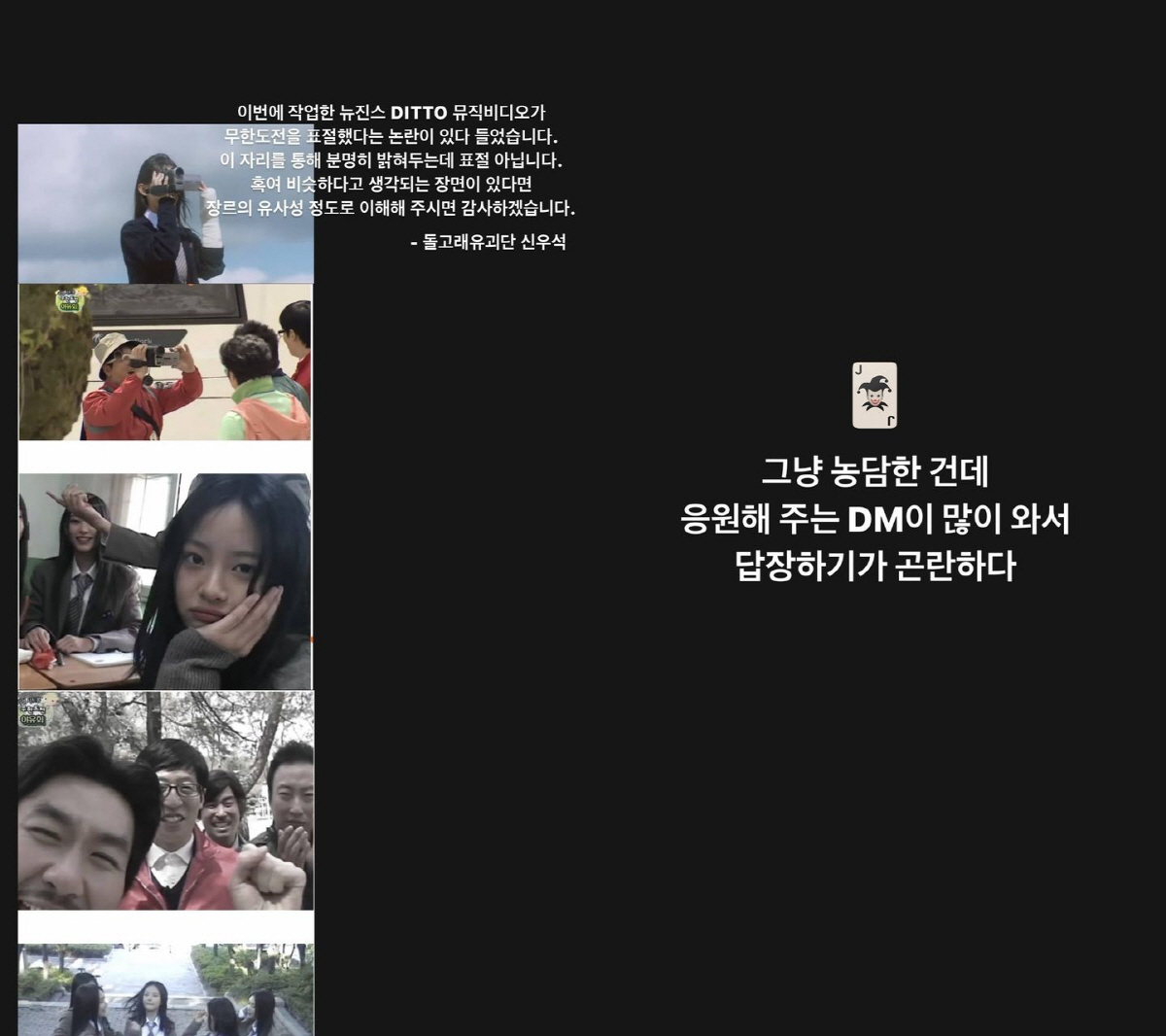 함께 공개된 사진 속에는 뉴진스의 신곡 'Ditto' 뮤직비디오와 MBC 예능프로그램 '무한도전'의 비교 컷들이 담겼다. 뉴진스 멤버들이 캠코더로 영상을 찍고, 셀프 영상을 찍는 모습 등이 무한상사 속 장면들과 비슷하다고 팬들 사이에서 장난식으로 표절 의혹이 불거졌기 때문. 이에 신우석 대표도 귀여운 해명을 덧붙였지만 이후 "그냥 농담한 건데 응원해주는 DM이 많아서 답장하기가 곤란하다"고 밝혀 웃음을 더했다.