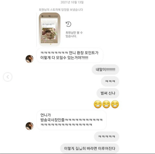 지인은 심진화에게 "언니의 환장 포인트가 어떻게 다 모일 수 있냐"라며 송혜교, 이도현 배우와 김은숙 작가까지 모인 것에 대해 언급했고, 심진화는 "내말이. 벌써 신난다"라며 기대감을 보였다.