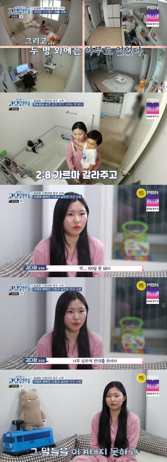 아빠 이해성의 흔적은 보이지 않았다. 김다정은 '장꾸' 시우를 열심히 씻기고 놀이터로 갔다. 김다정은 "일주일에 6번씩 간다. 날씨가 좋으면 해 뜨기도 전에 간다"고 밝혔다. 시우를 놀아주던 김다정의 주변에는 아이를 놀아주러 온 아빠들이 있었다. 김다정은 아기 아빠 이해성에 대해 "아기 태어나고 100일 못 돼서 헤어졌다"고 털어놨다. 홀로 아이를 키워온 것. 헤어진 이유에 대해서는 "시댁 부모님이 (태어나고도) 심하게 반대하셔서 그 말들을 이겨내지 못하고 혼자 사는 게 낫겠다 싶어서 따로 살자고 했다"고 고백했다. 김다정은 "따로 살자고 말한 게 시우에게 정말 미혼모의 아들이 된 것만 같았다. 시우한테 미안했다"고 털어놨다.