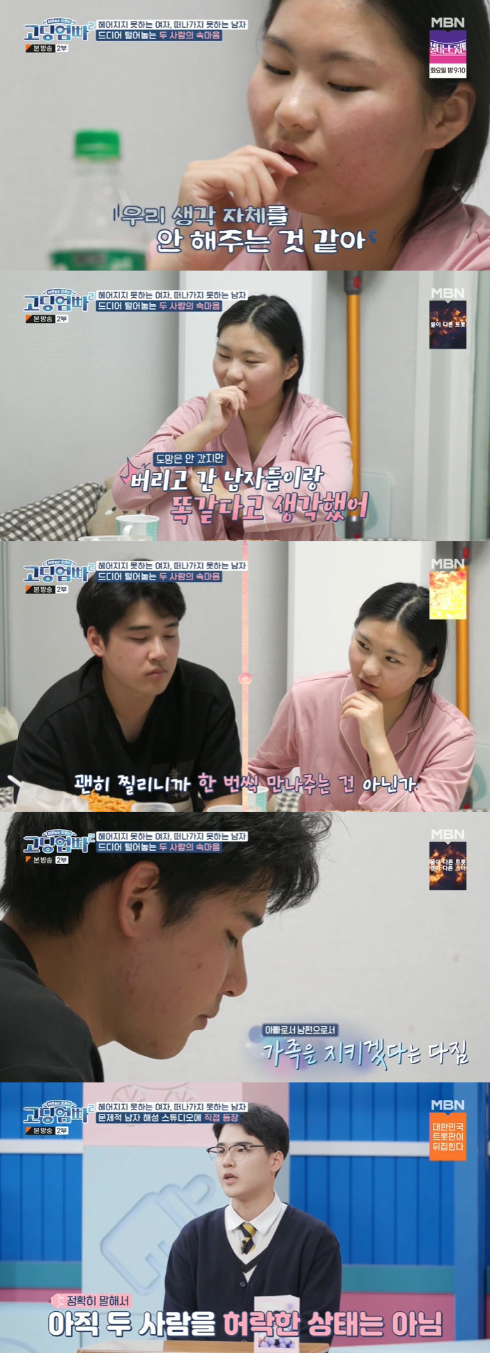 이에 이해성은 "난 진짜 시우를 생각하면 네가 힘든 게 와 닿는다. 이게 일상이었으면 좋겠다"고 밝혔다. 하지만 김다정은 "왜 연락을 잘 안 하는 거냐. 우리 생각 자체를 잘 안 해주는 거 같다. 도망은 안 갔지만 버리고 간 남자들이랑 똑같다 생각했다"고 속상한 마음을 고백했다.